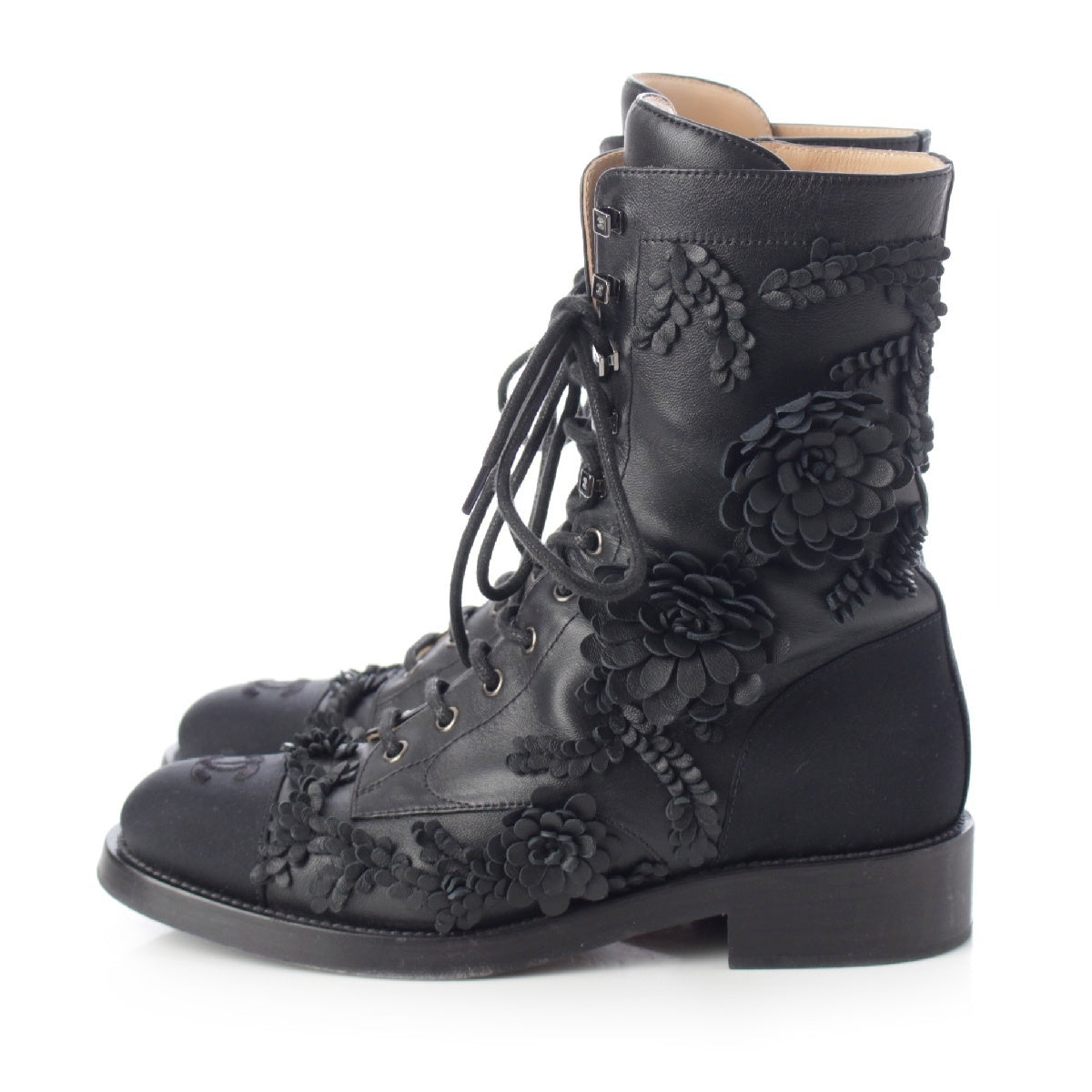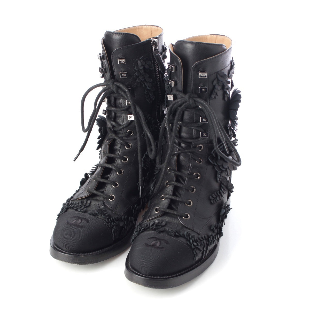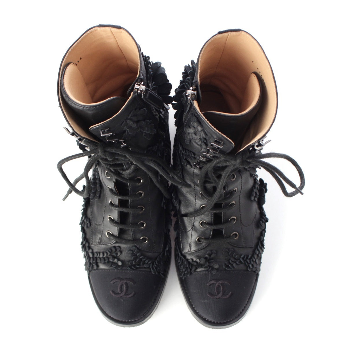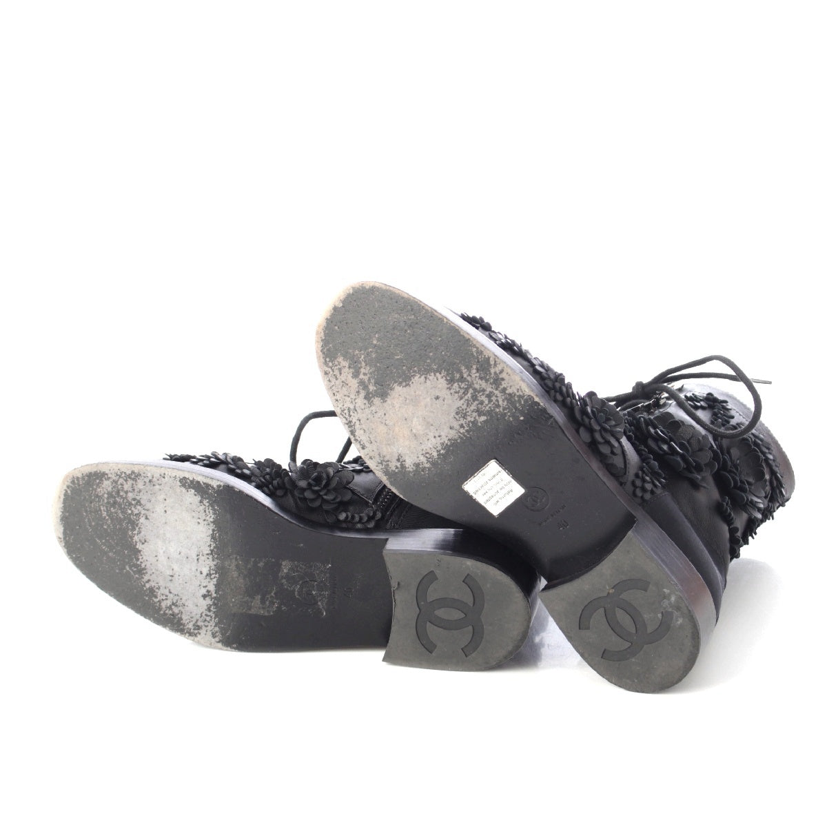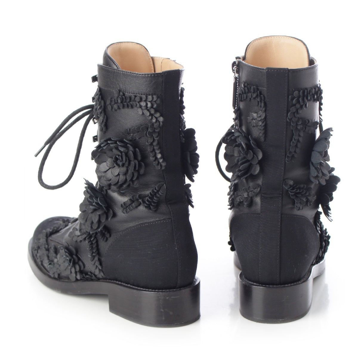 CHANEL leather Camellia lace-up ankle boots COCO Mark embroidery G36066 black 40