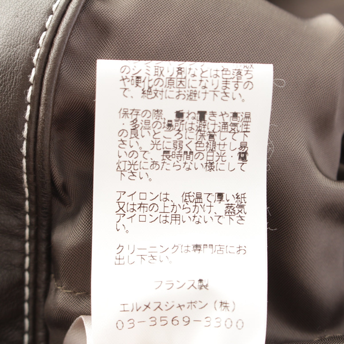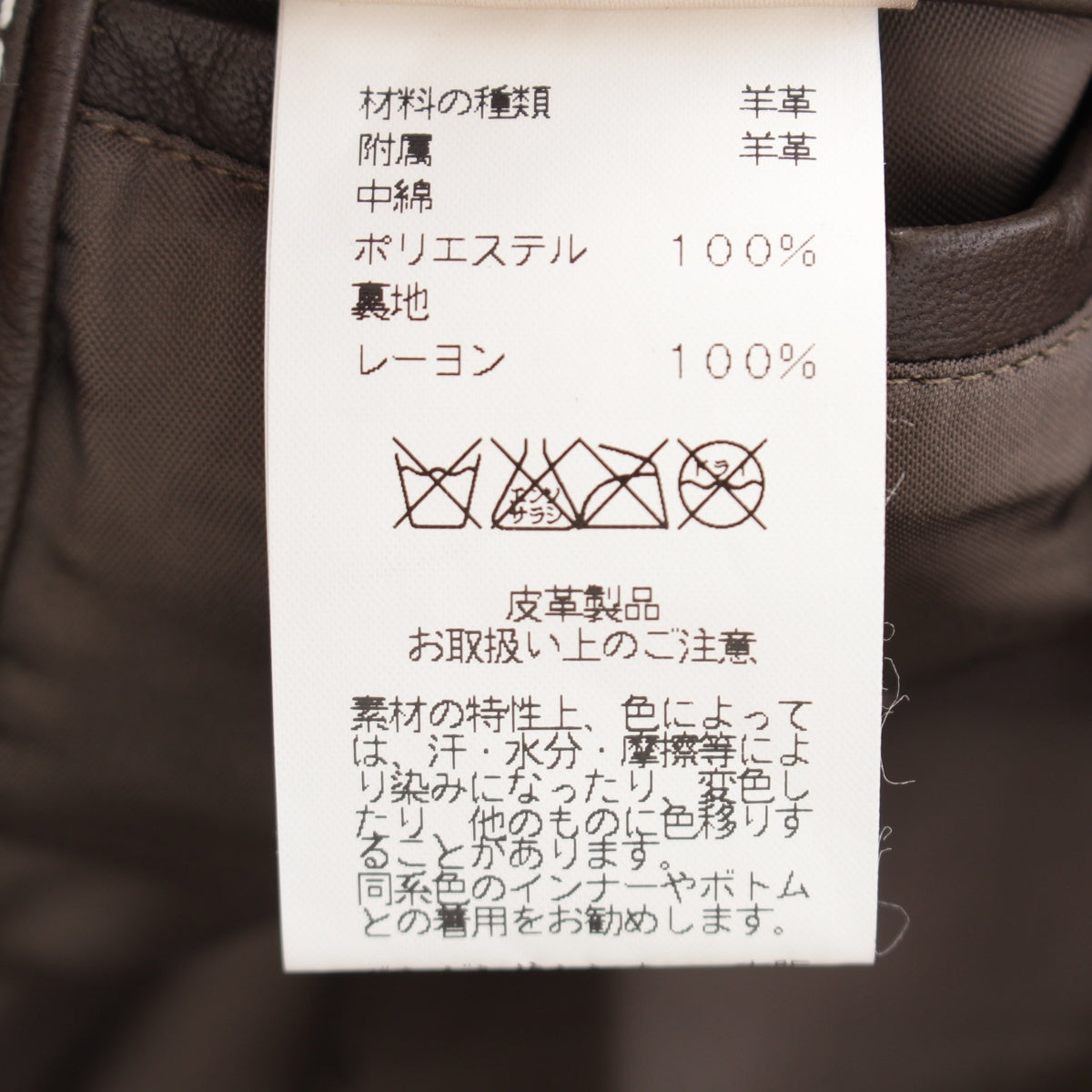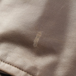 onCountry of origin tag on the neck of the jacket, bottom right corner of the back, etc.Stain、onUpper backscrub、onLeather liner, center of abdomen, right hem, back shoulder, etc.Stain,Scar、onLeather parts on the shoulders of the jacket, entire leather linerWrinkles、onBrand tagSoldemark、Smells likeStorage odor