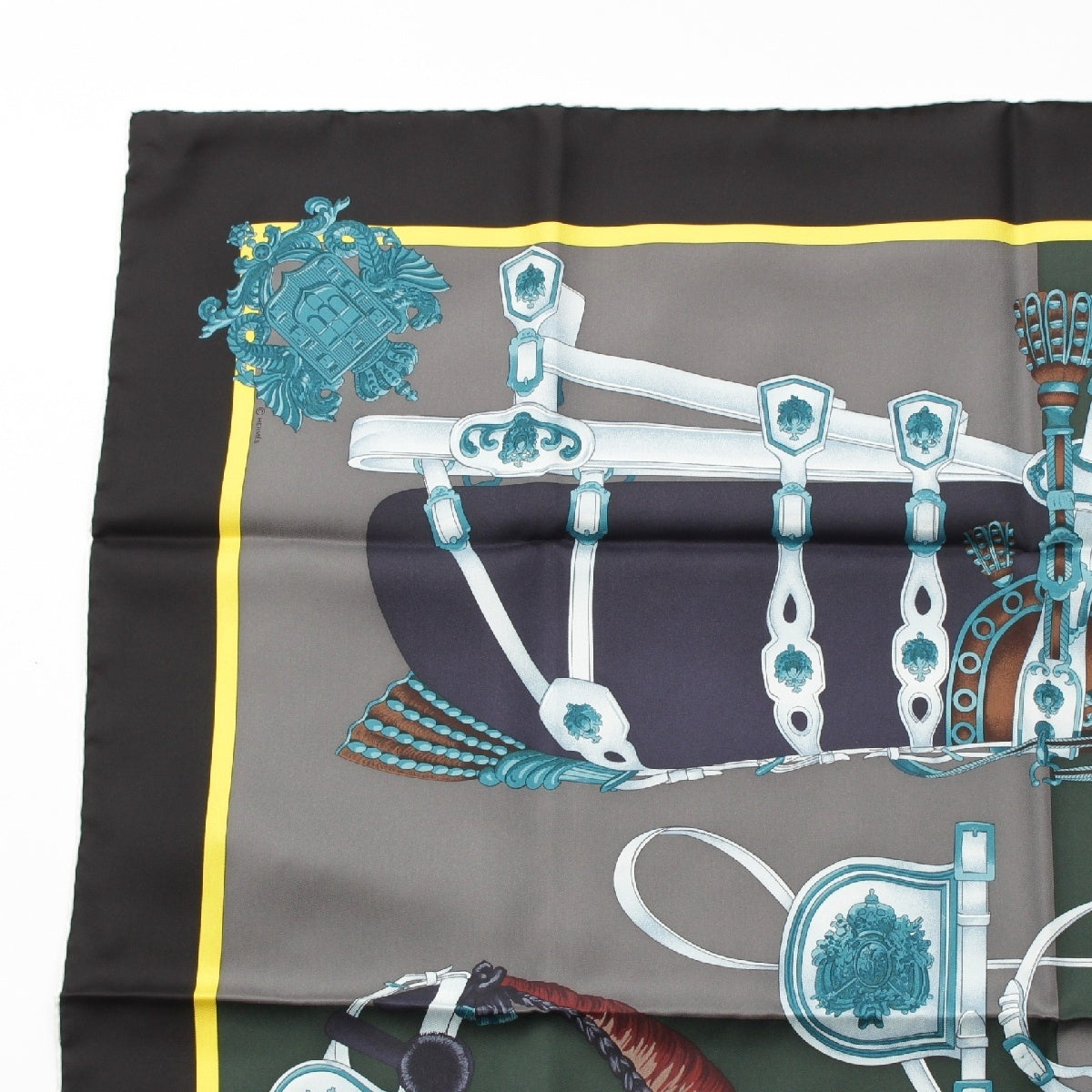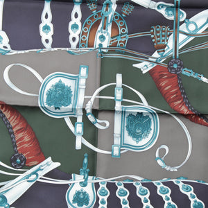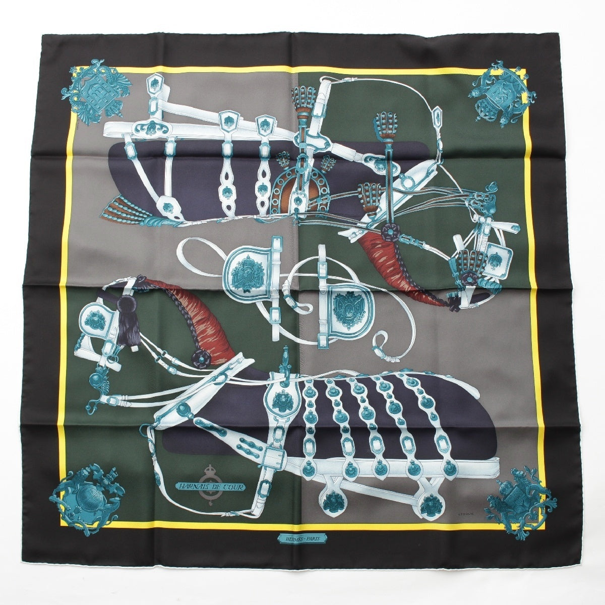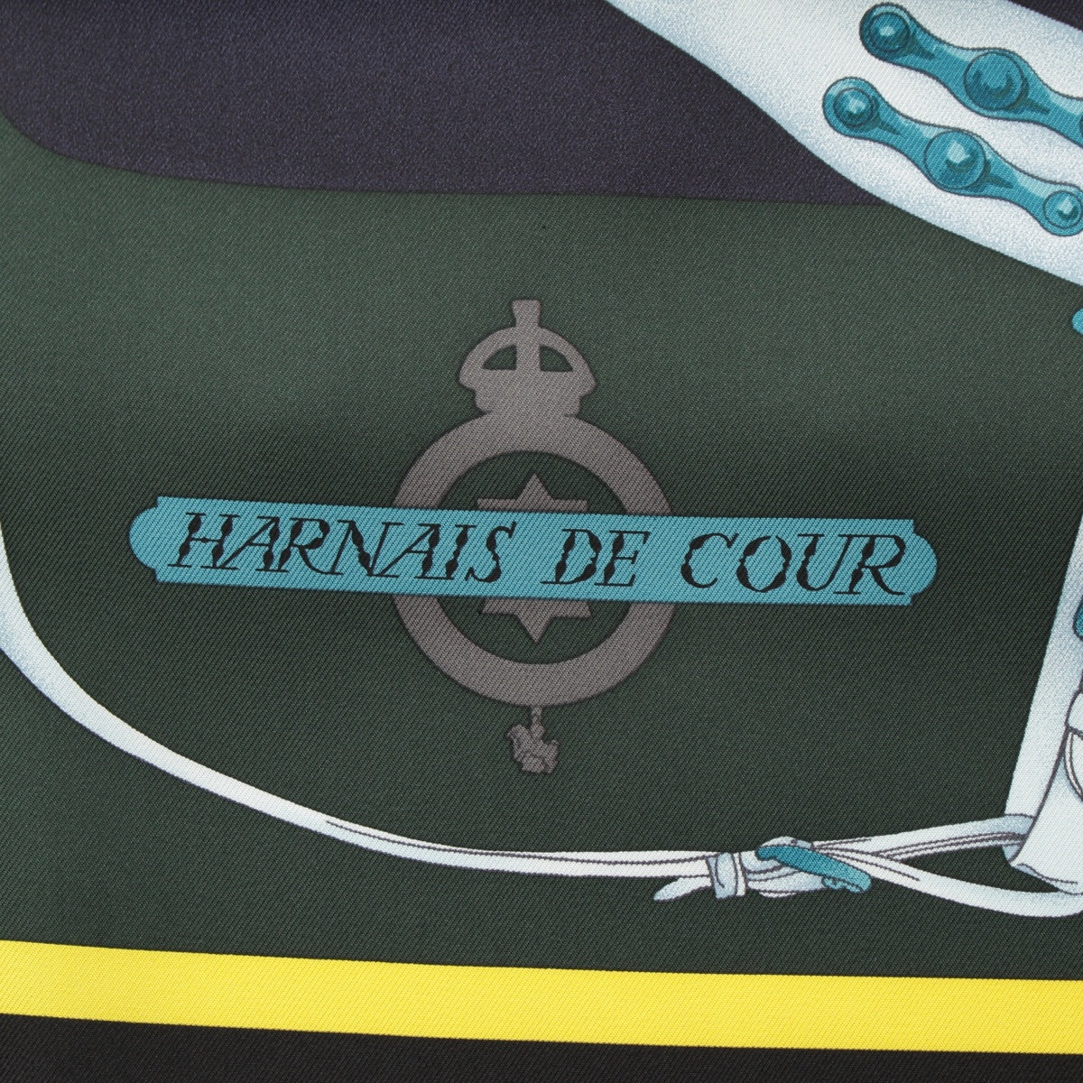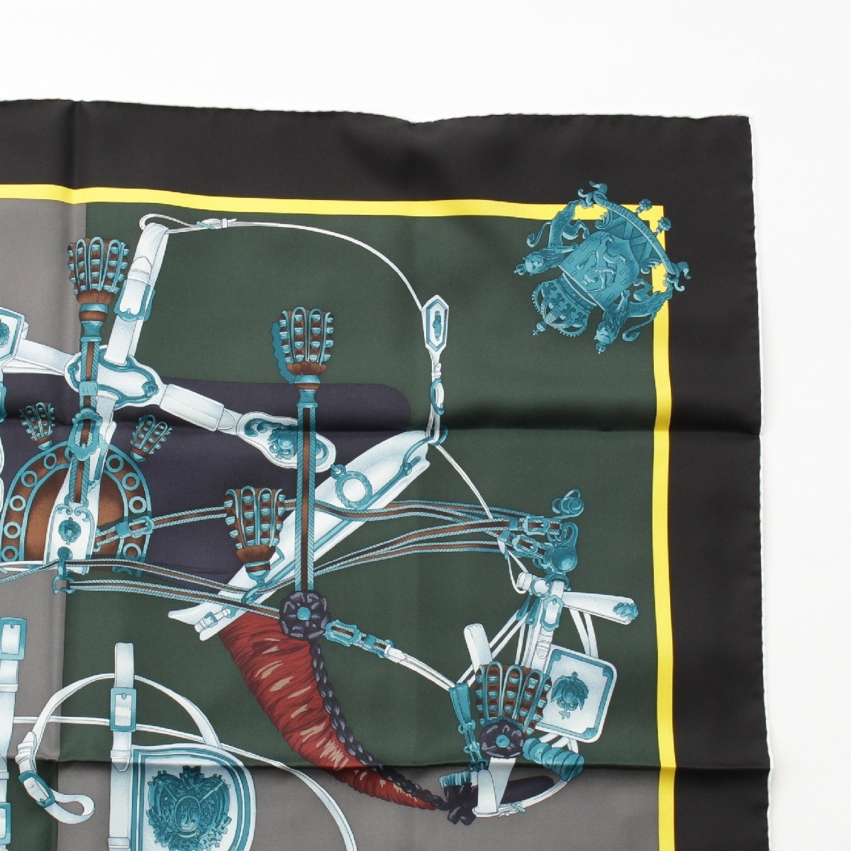 HERMES Calle 90 silk HARNAIS DE COUR Court harness scarf emblem Black x blue