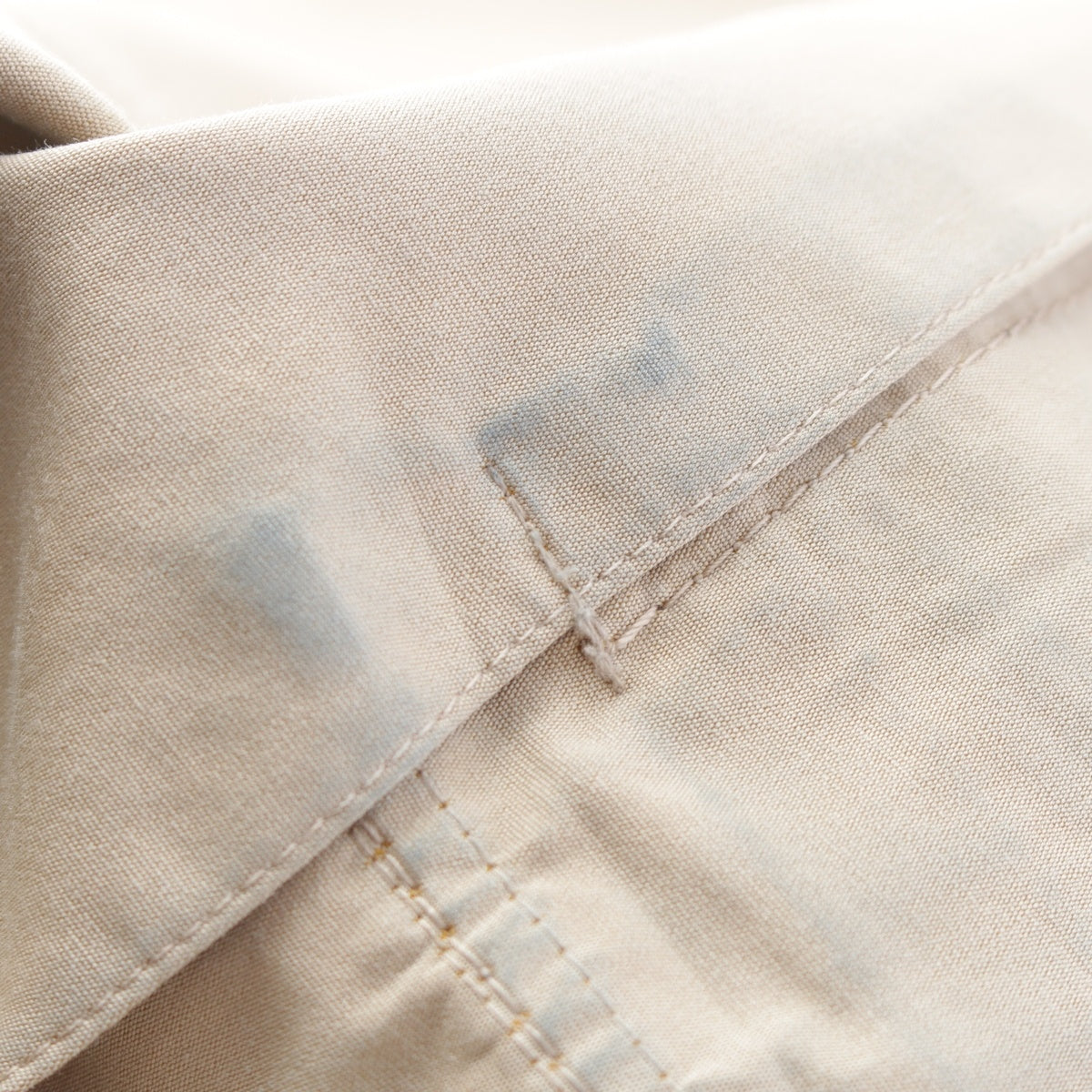 onCollar, hem and liningStain、onbuttonslack、onbeltStain、