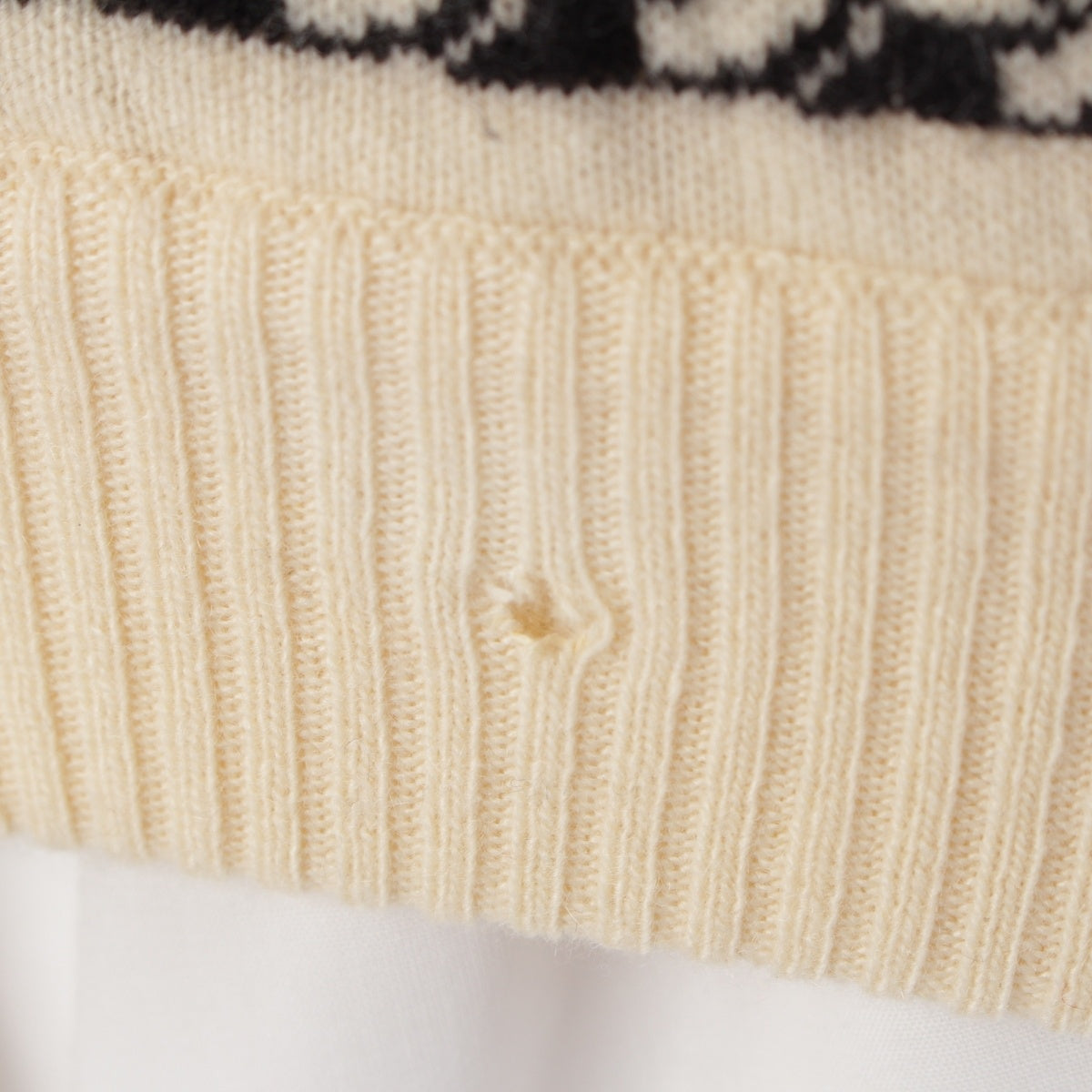 onLeft elbow, top center of front hem, etc.Stains,Stain、onCenter of front hempierced、onWhole knitFluffing、