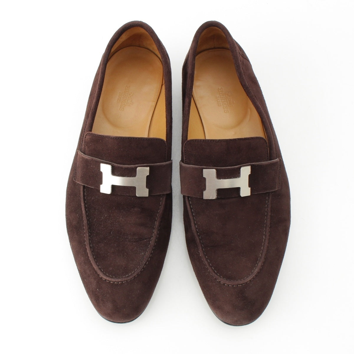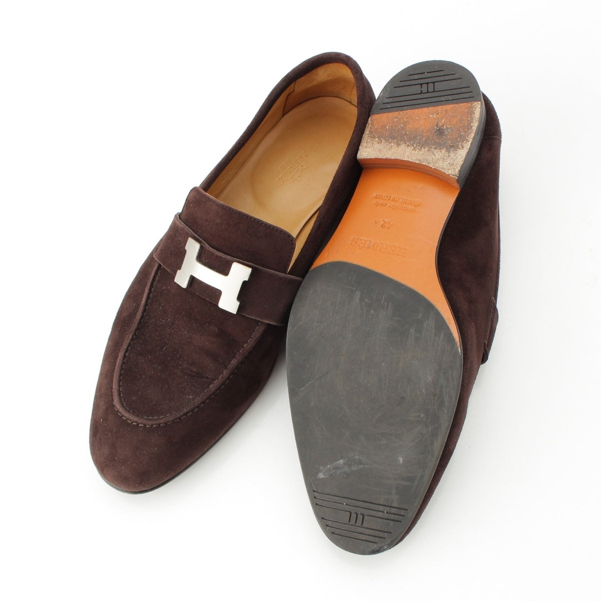 HERMES Paris Moccasin Suede leather Flat shoes Matte Silver Metal loafers Brown 42