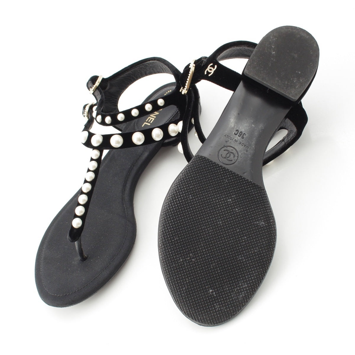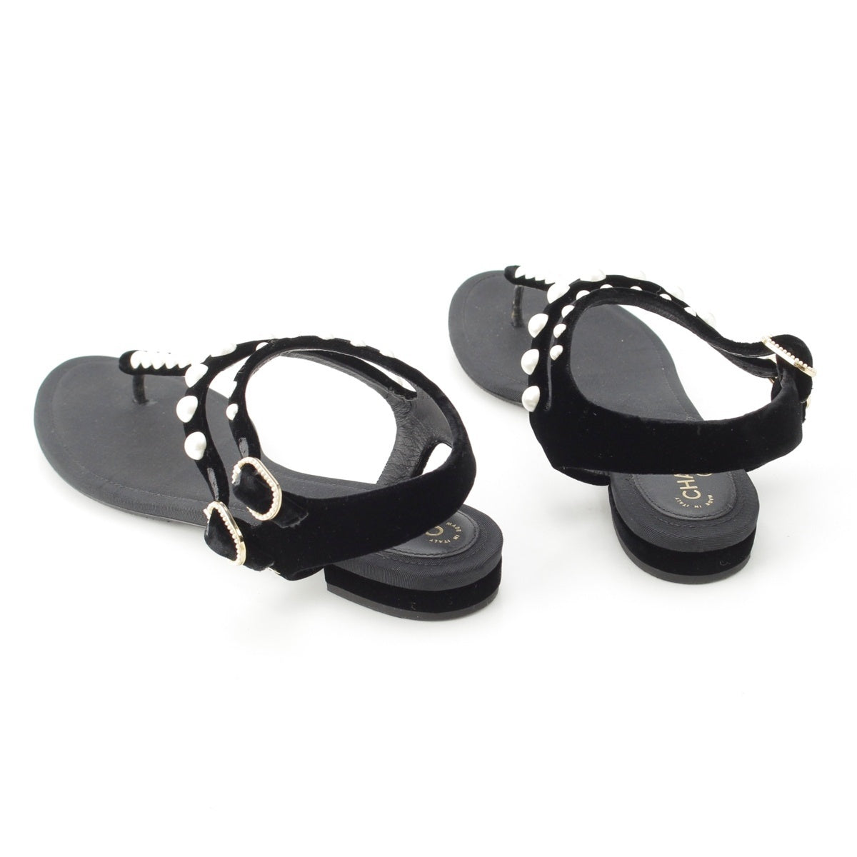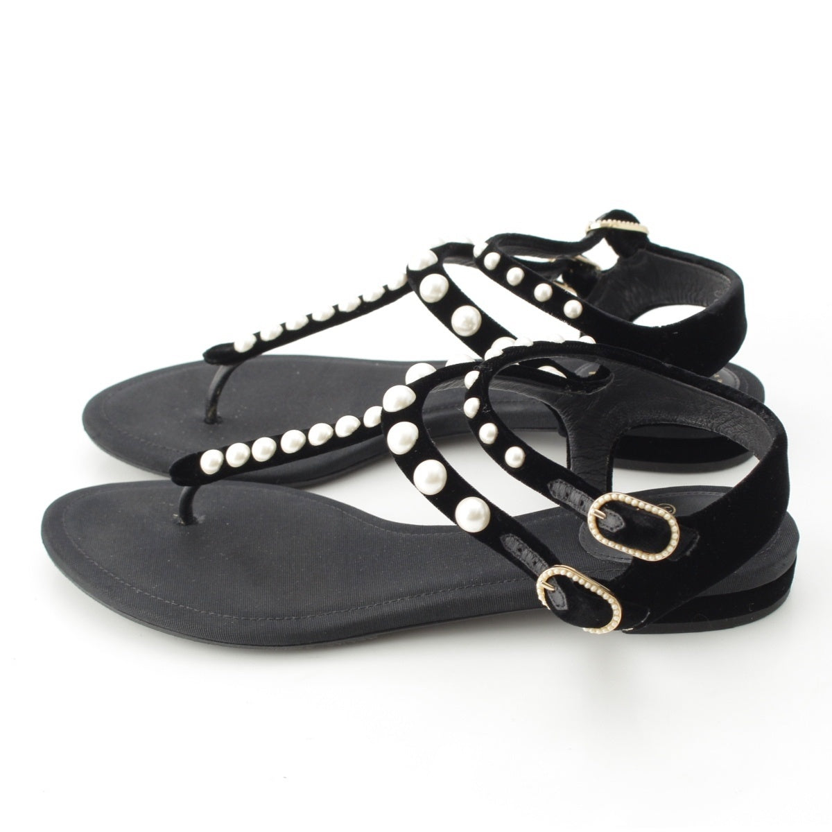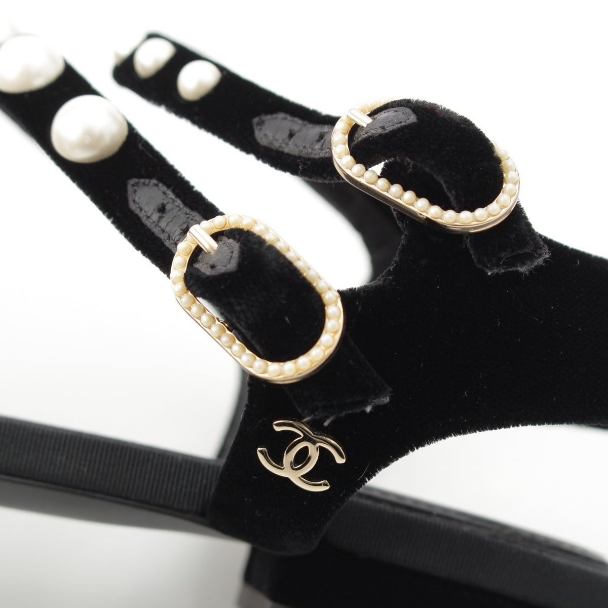 CHANEL Suede Pearl Toggle Sandals Shoes Flats black 36C