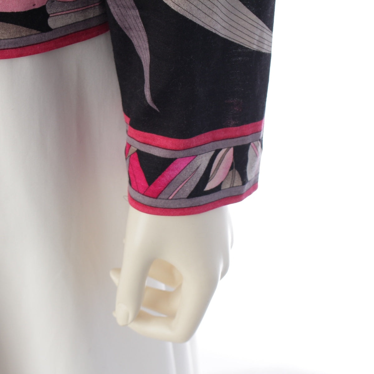 Left cuff inside: fraying present. Upper left sleeve: fluffing present.、