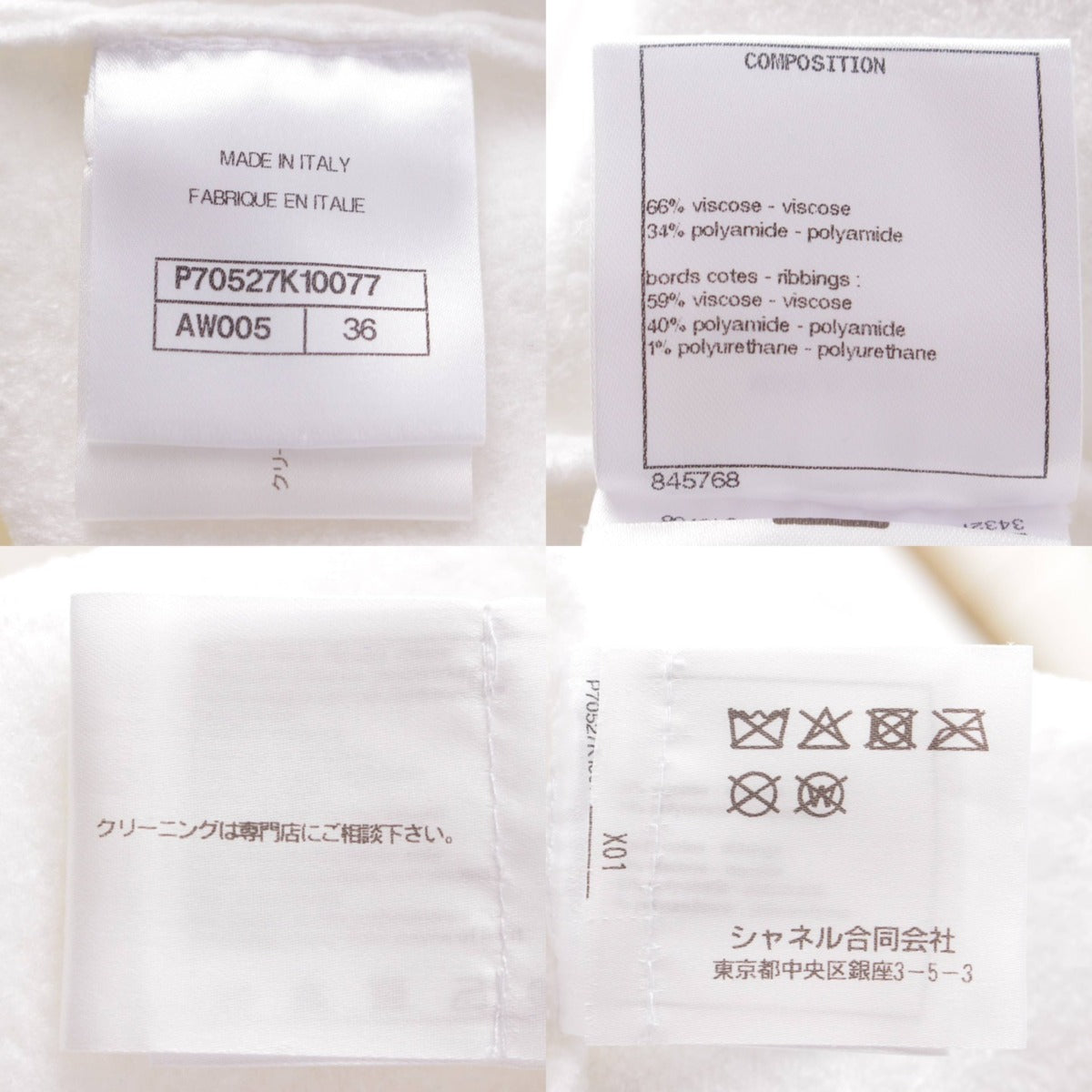 .detail {width:400px; font-size:12px;border-top:#000 2px solid; line-height:1.5em;border-bottom:#666 1px solid; margin-bottom:5px;}.detail .title{ padding:10px;border-bottom:#666 1px solid; background-color:#e3e3e3; margin:0;}.detail .text{ padding: 5px 10px;} Product details Material: Please see the composition tag Color: White Product number: P70527 Accessories: - Damage: Slight stain on the back, odor due to use and storage New reference price: yen * Since this is a used item, there may be damage that is not listed on the main unit or accessories. Please note. Product condition A: Little signs of use, no noticeable scratches or damage. Size: 36 Shoulder width: around 19.3" Bust: around 19.7" Sleeve length: around 6.3" Length: around 22.4" *Measurements taken flat. Please allow for some error.