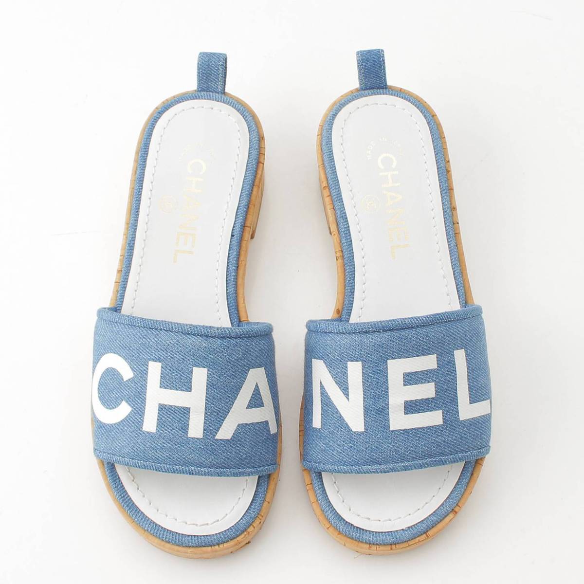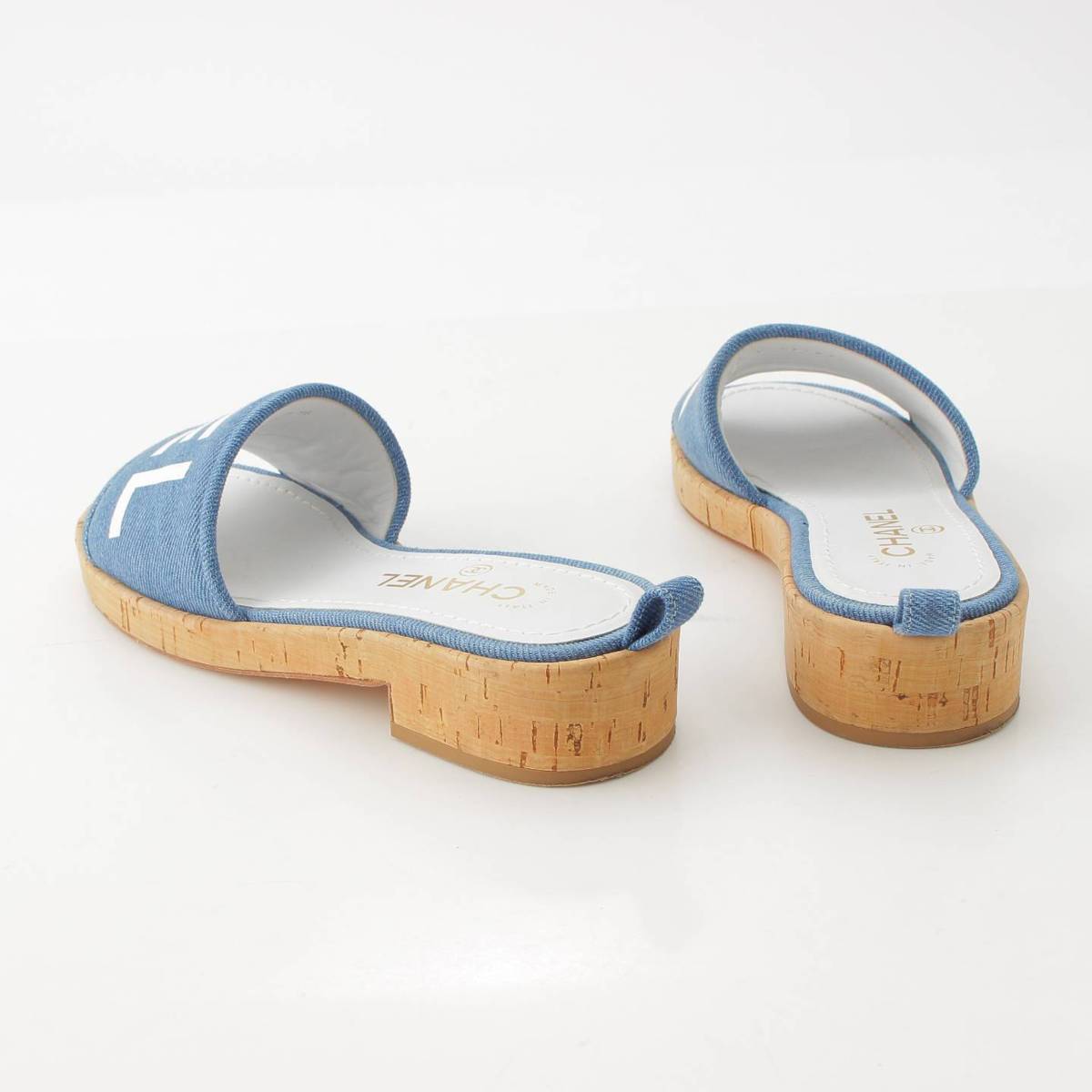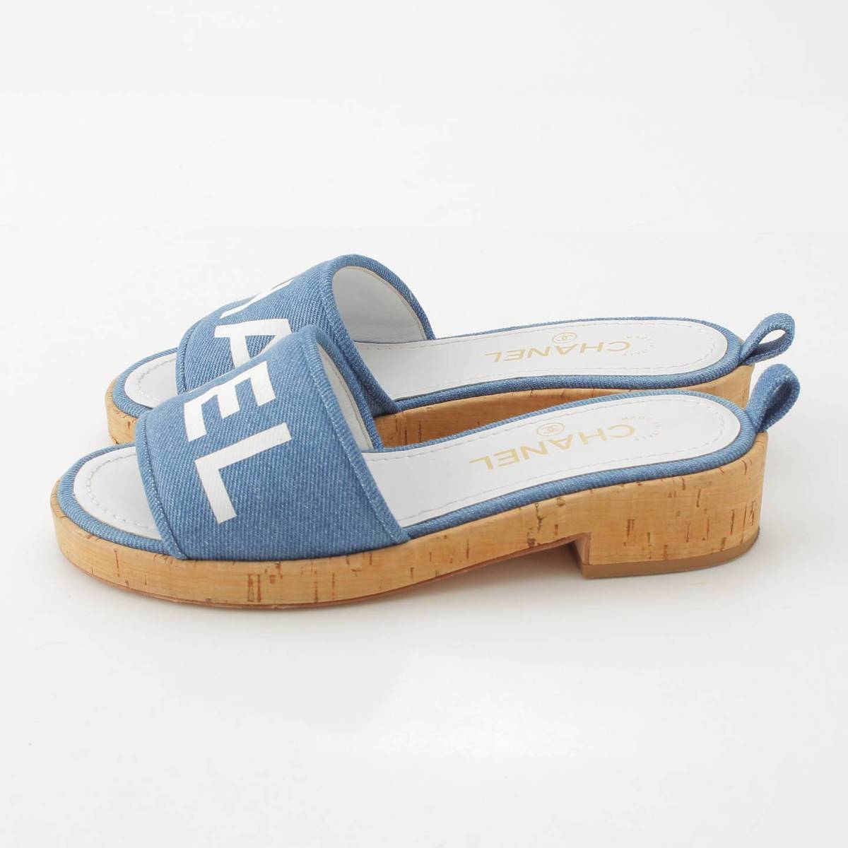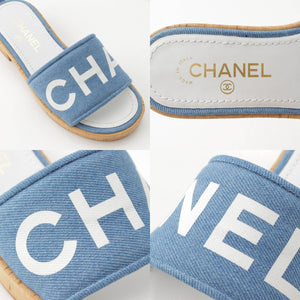 [Chanel] Chanel 19 Stainless Steel Denim Logo Cork Sole Sandals Mules G34876 Blue x White 35 1/2 [Used] [Authenticated and Guaranteed Authentic] 211682