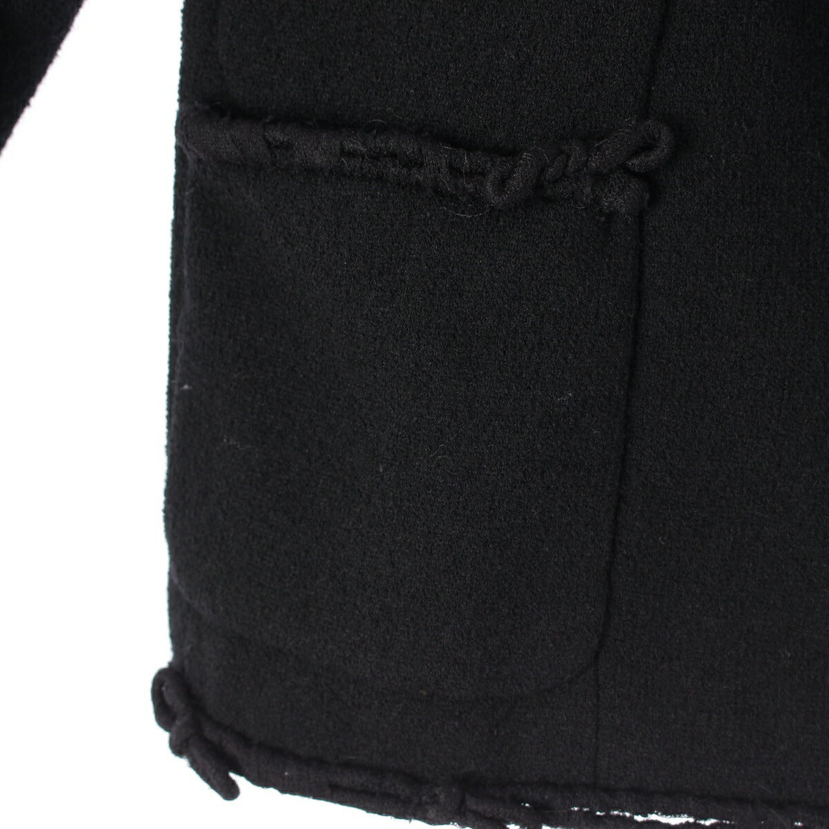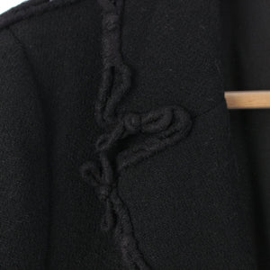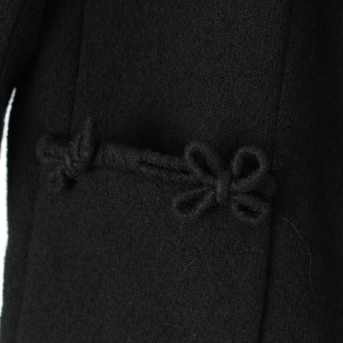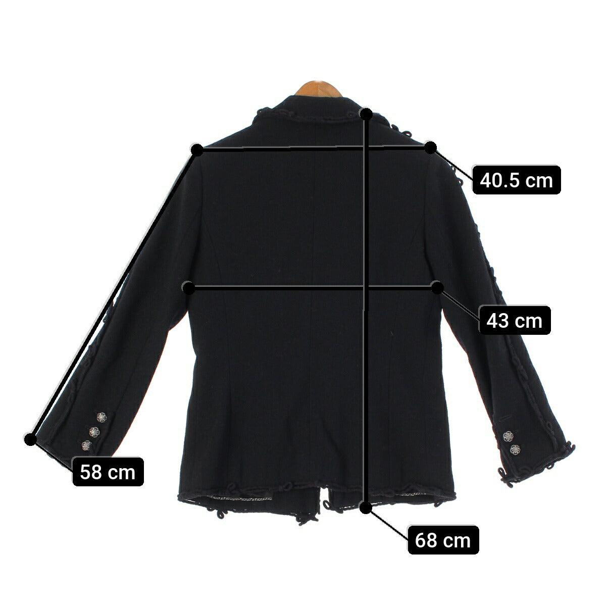 .detail {width:400px; font-size:12px;border-top:#000 2px solid; line-height:1.5em;border-bottom:#666 1px solid; margin-bottom:5px;}.detail .title{ padding:10px;border-bottom:#666 1px solid; background-color:#e3e3e3; margin:0;}.detail .text{ padding: 5px 10px;} Product Details Color: Black Material: Please see the composition tag Accessories: - Damage: Missing button on right sleeve Fluffing on ribbon motif part ※As this is a used item, there may be damage that is not listed on the main body or accessories. Please note. Product condition B: Signs of significant use, scratches, stains, and other damage Size Total length: around 26.8" Shoulder width: around 15.9" Body width: around 16.9" Sleeve length: around 22.8" ※Measured flat at maximum part