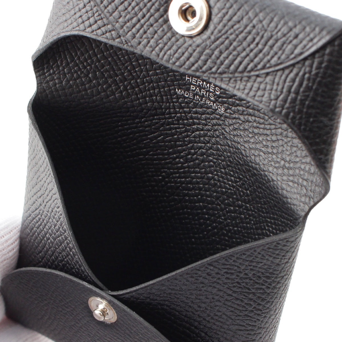 .detail {width:400px; font-size:12px;border-top:#000 2px solid; line-height:1.5em;border-bottom:#666 1px solid; margin-bottom:5px;}.detail .title{ padding:10px;border-bottom:#666 1px solid; background-color:#e3e3e3; margin:0;}.detail .text{ padding: 5px 10px;} Product details Color: Black Material: Epsom Closure: Snap button Accessories: Outer box *As this is a used item, there may be damage not listed on the product or accessories. Please note. Product condition Unused: Protective stickers and price tags are included, and the product can be considered unused. Size Width: around 3.3" Height: around 3.1" Depth: around 0.3" *Measured flat at maximum part