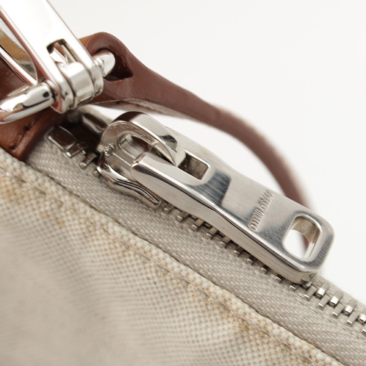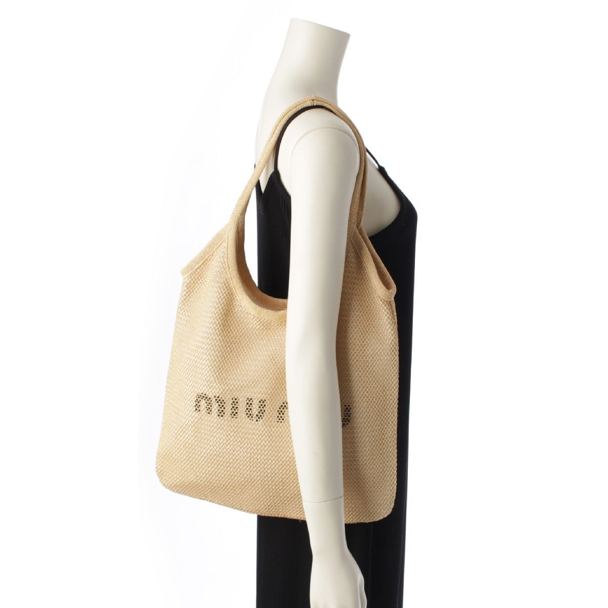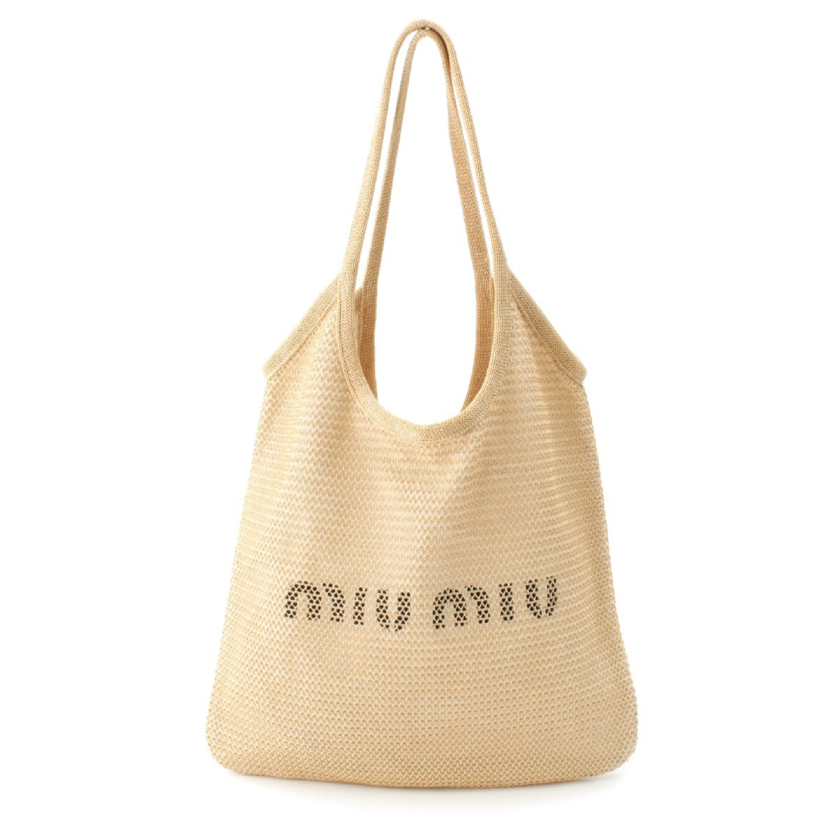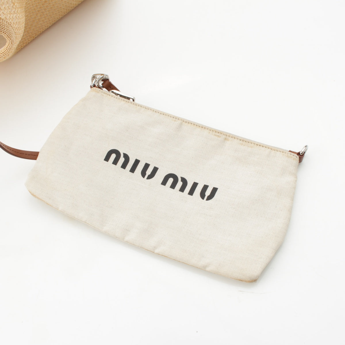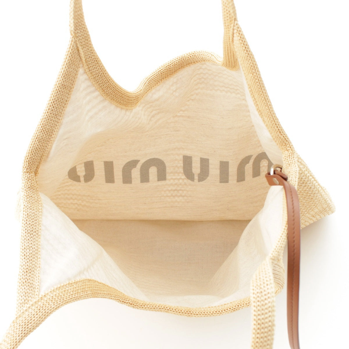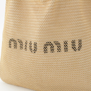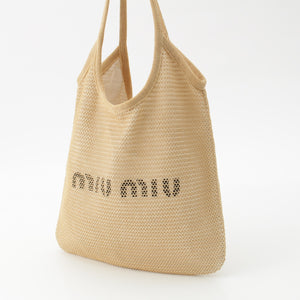 MIUMIU Raffia Linen Logo leather strap with pouch Tote Bag Handbag 5BG231 beige