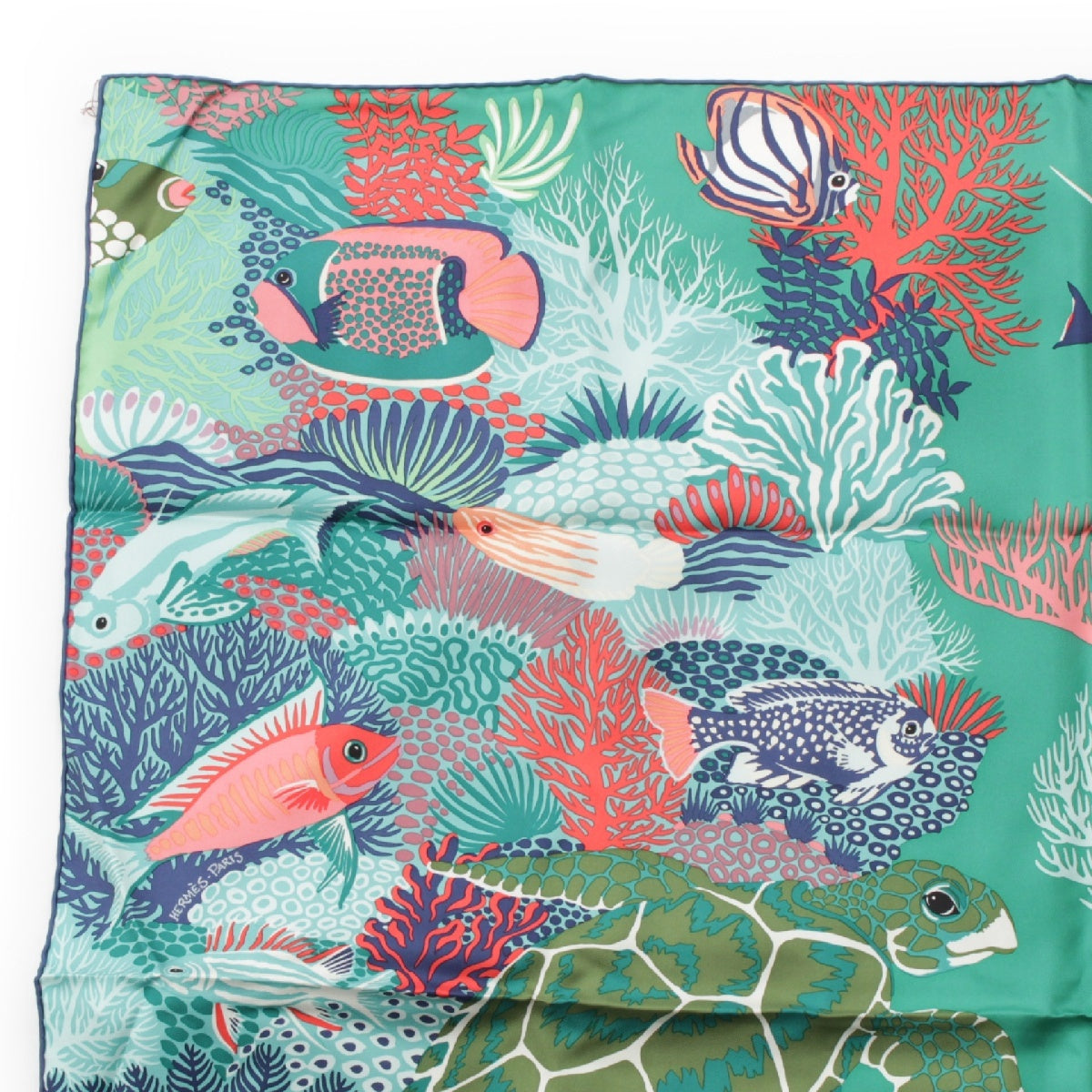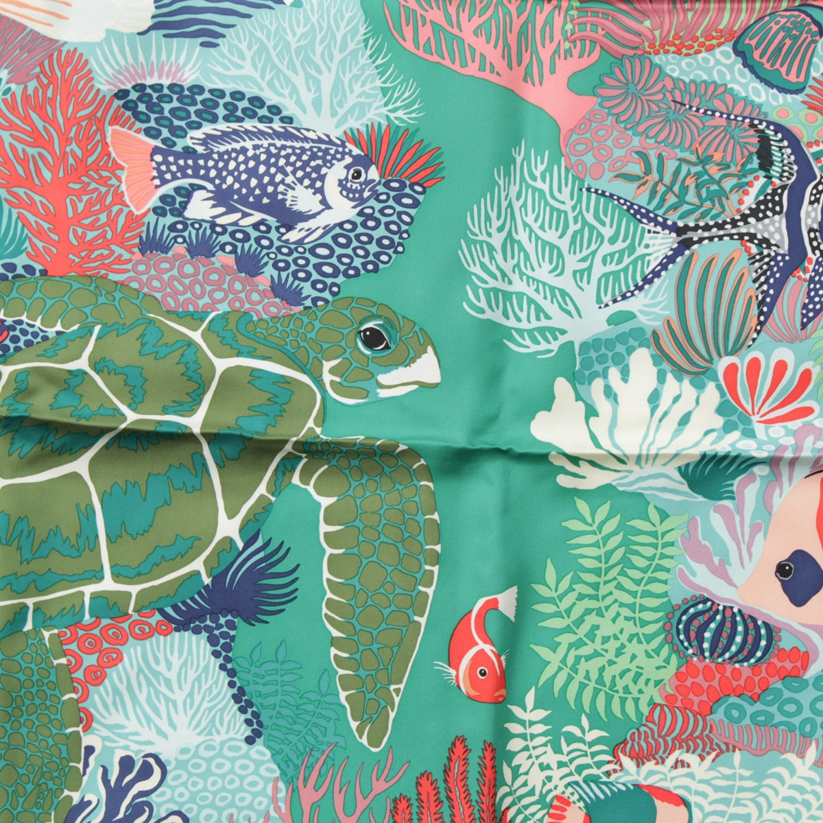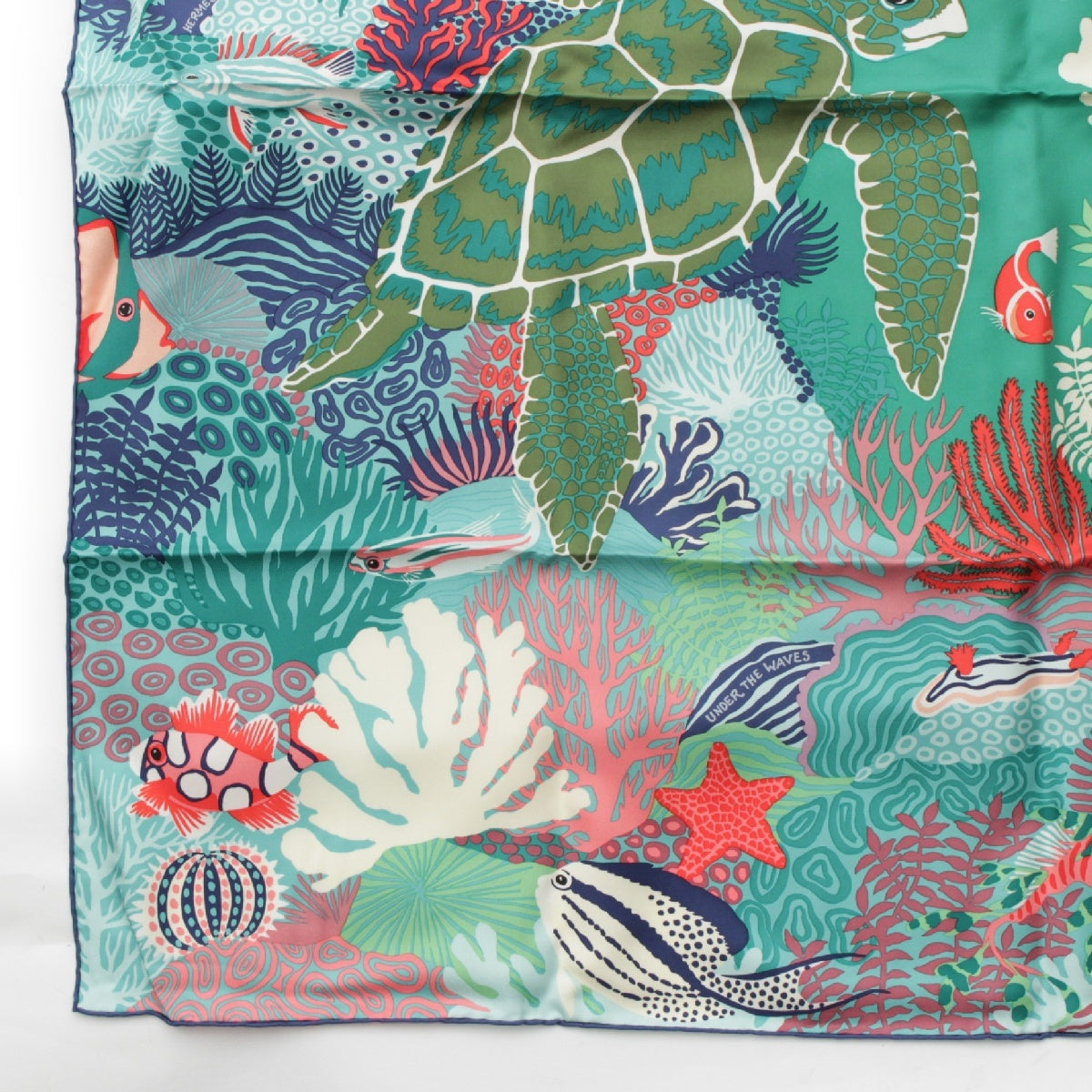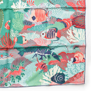 HERMES Calle 90 silk UNDER THE WAVES scarf Fish Seaweed green