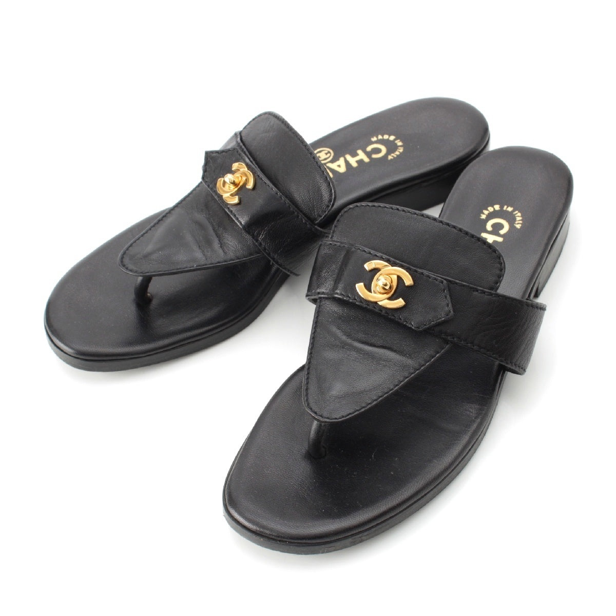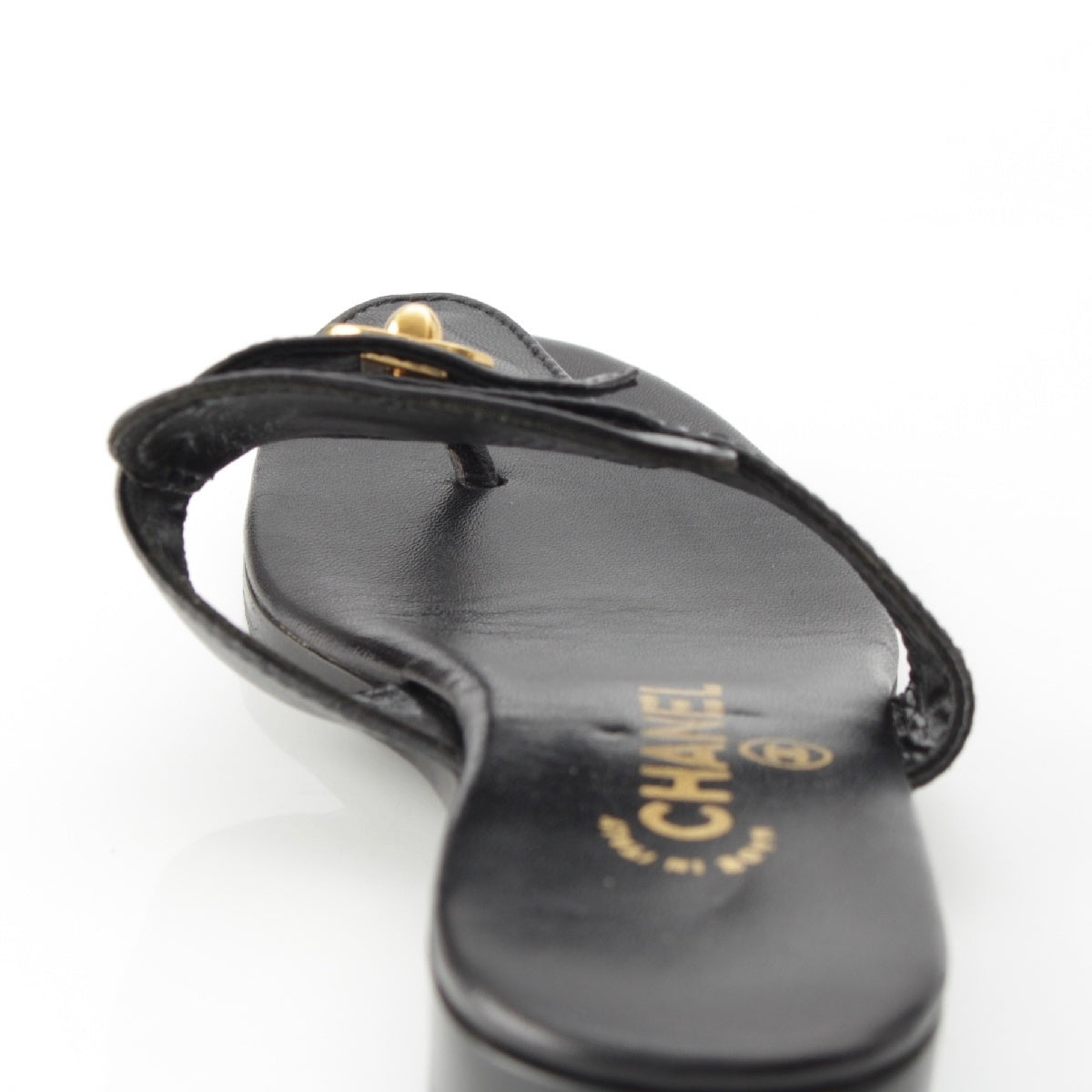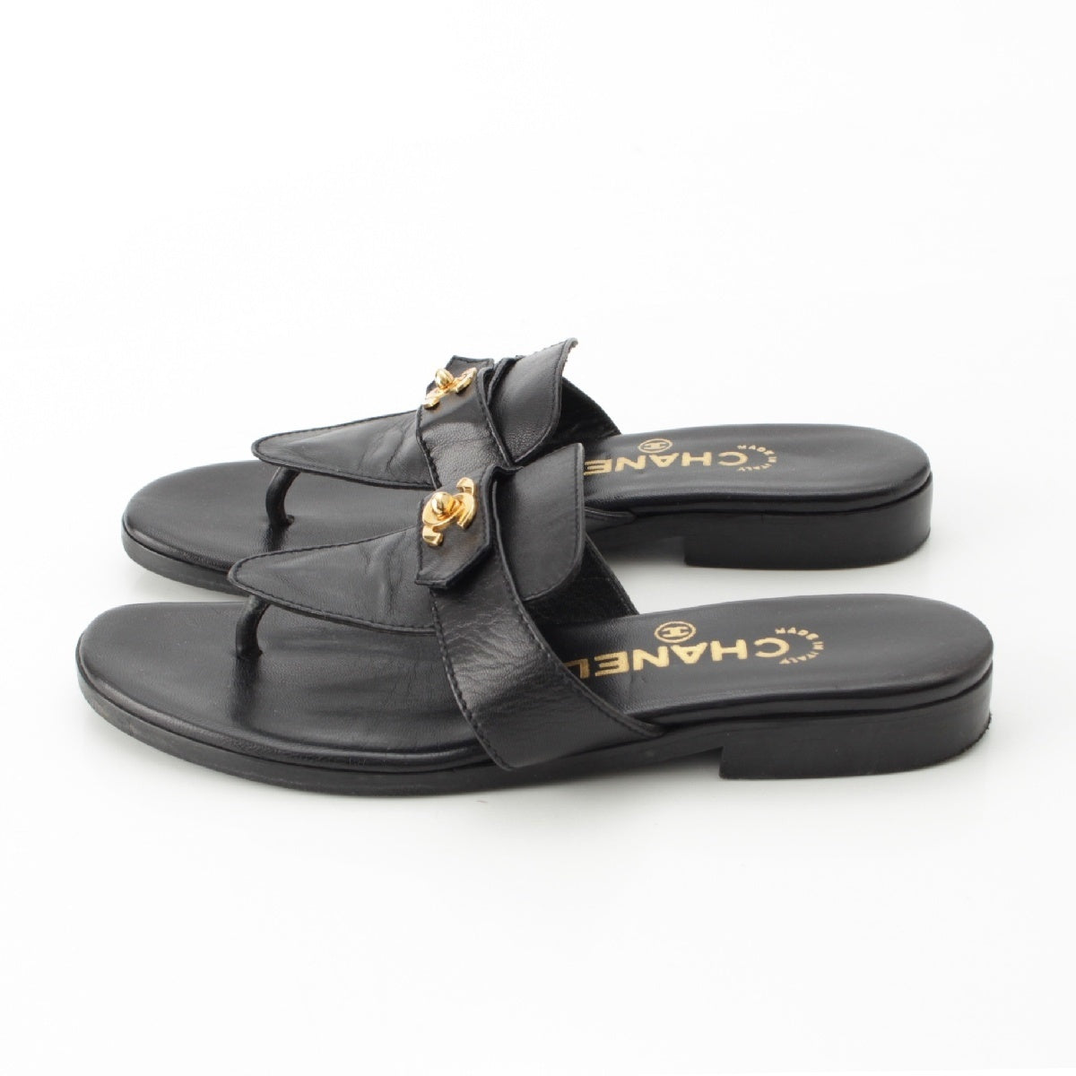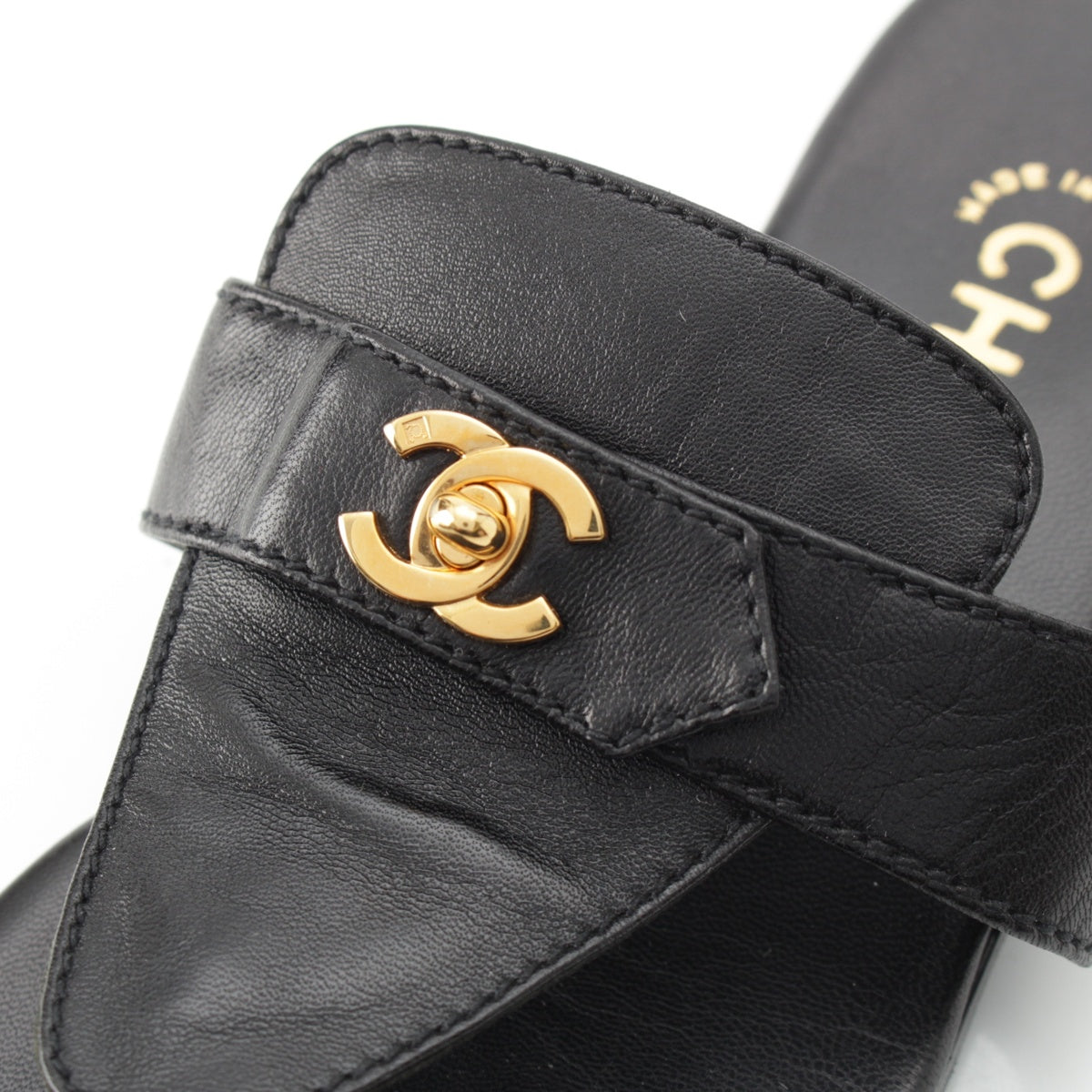 CHANEL 96P leather Vintage Turnlock COCO Mark Sandals shoes Black gold 37