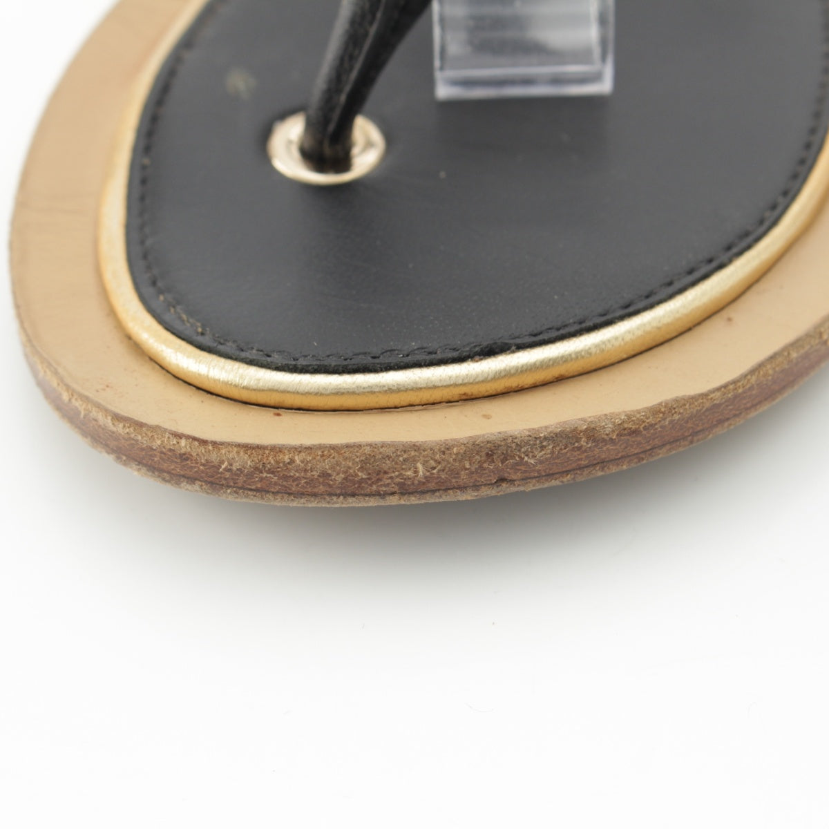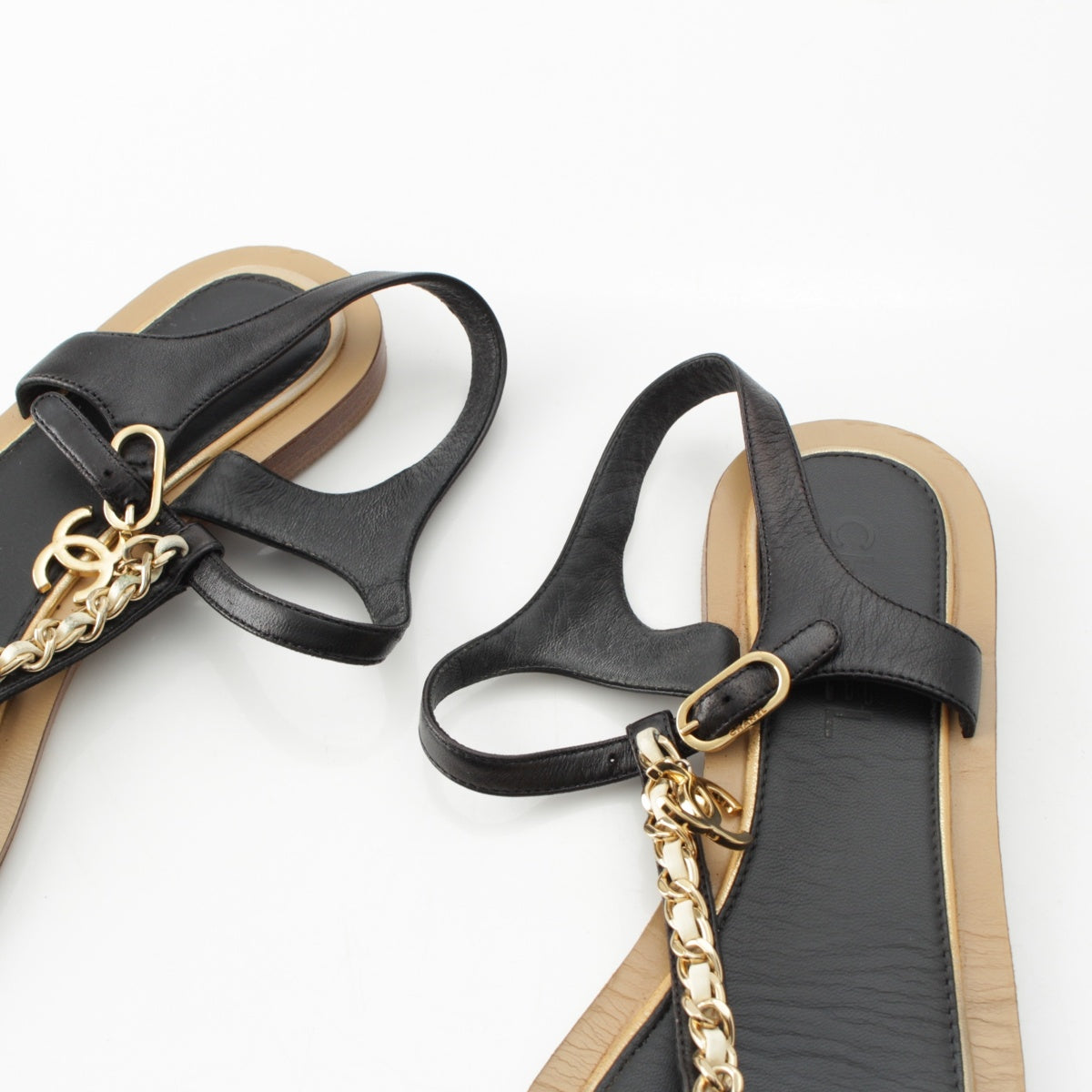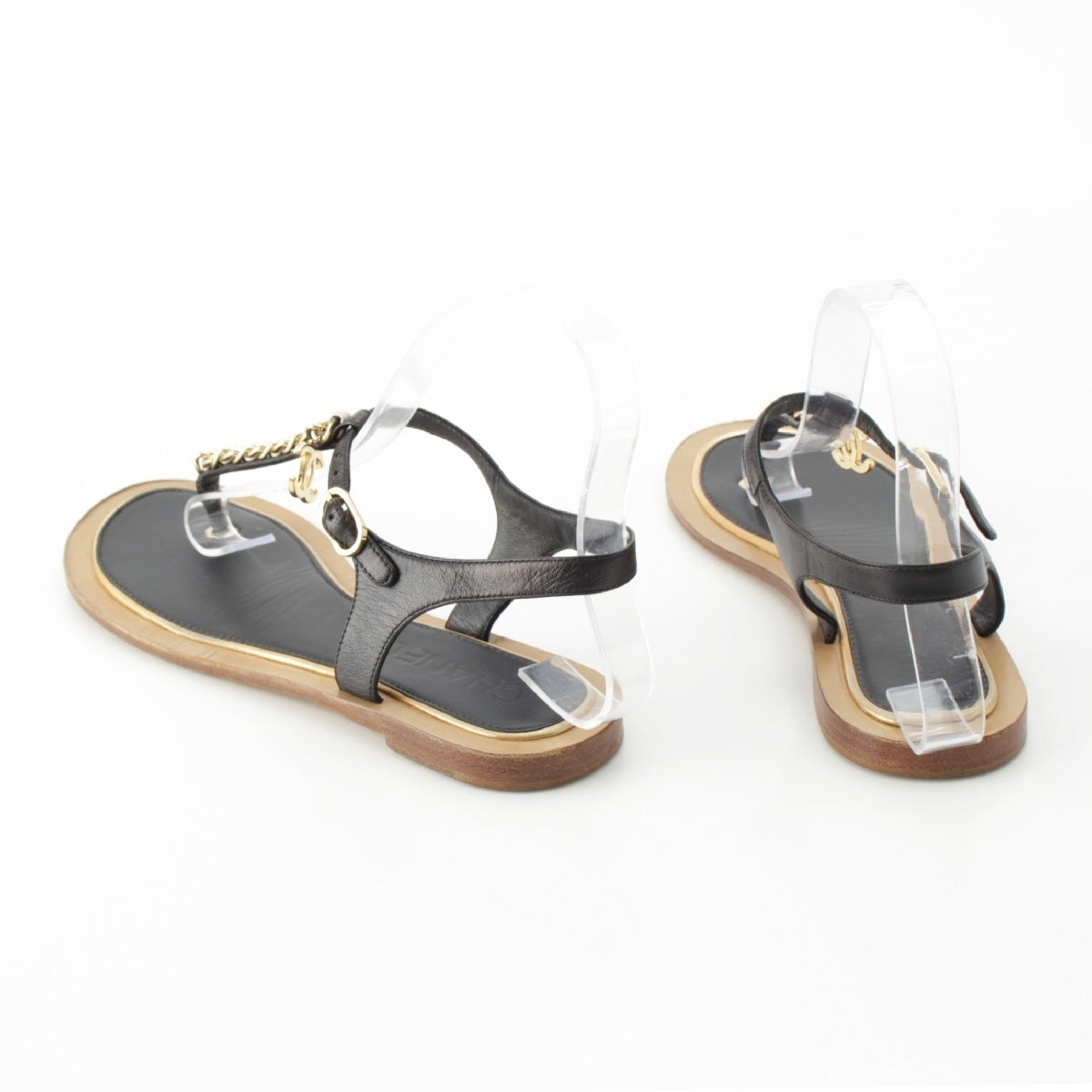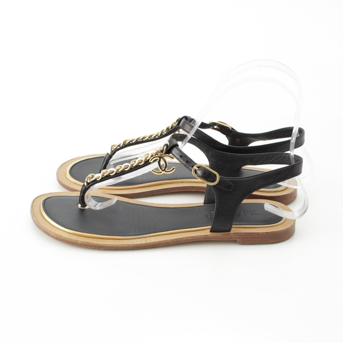 CHANEL leather COCO Mark Chain Thong Sandals shoes Black x beige 37