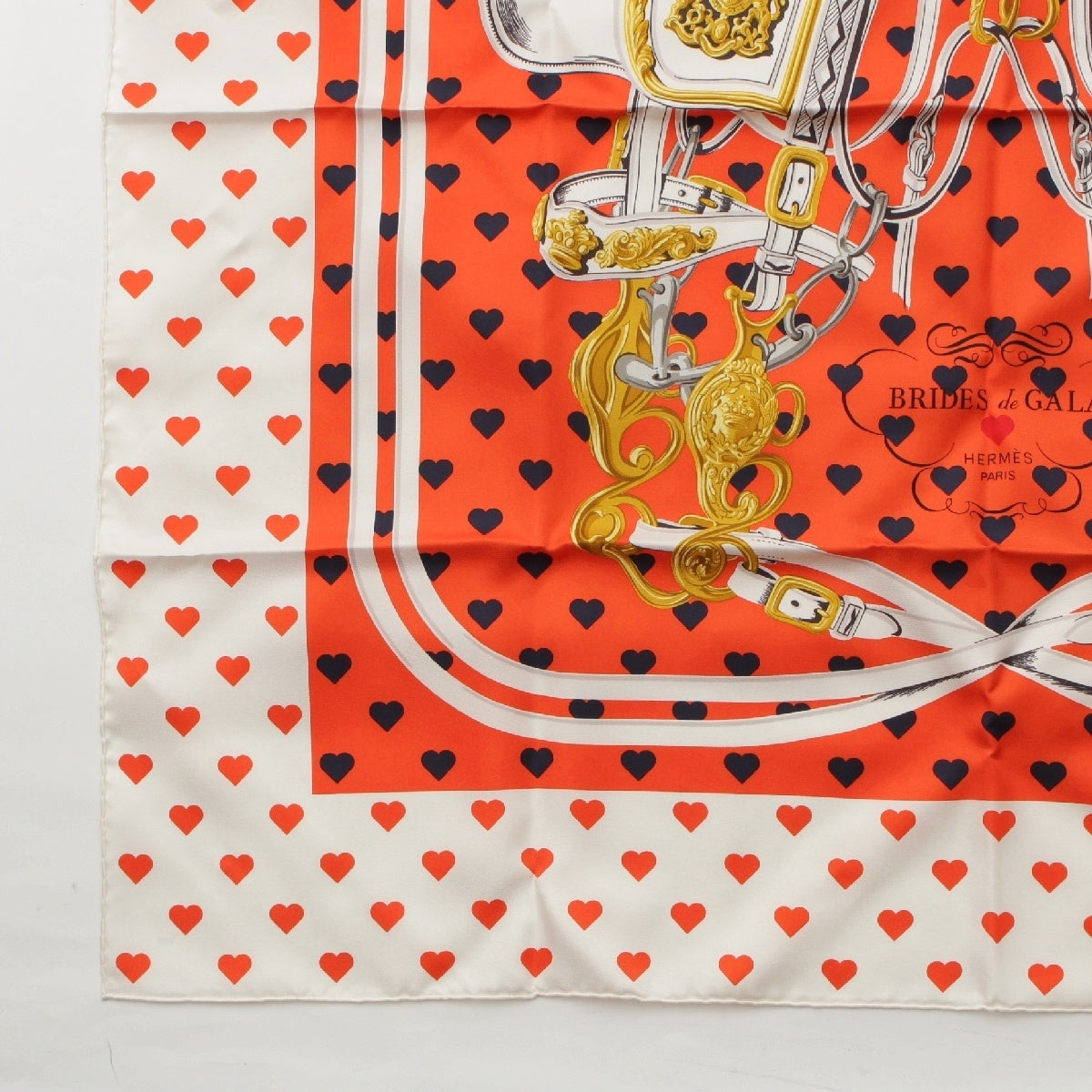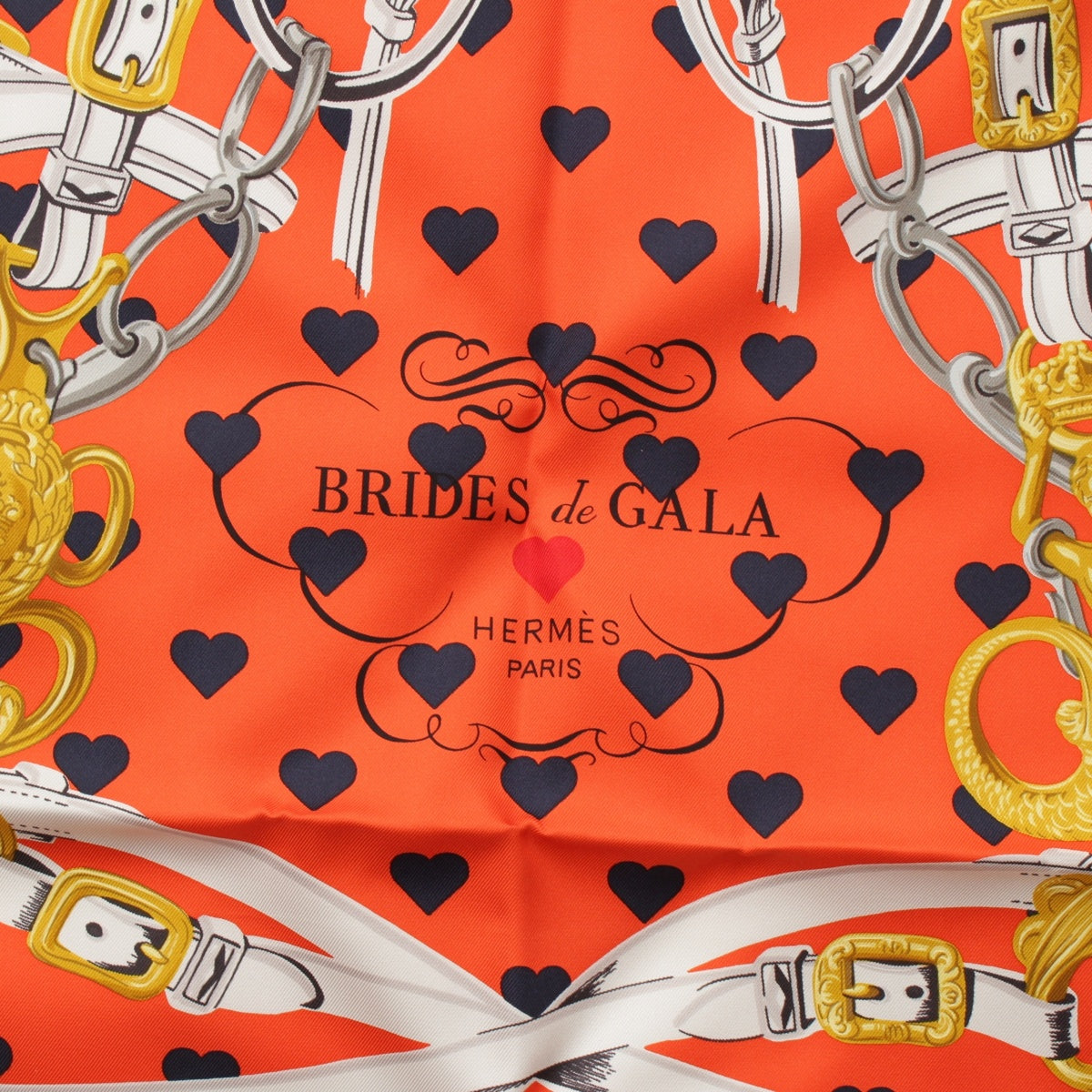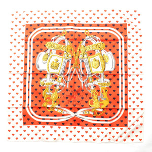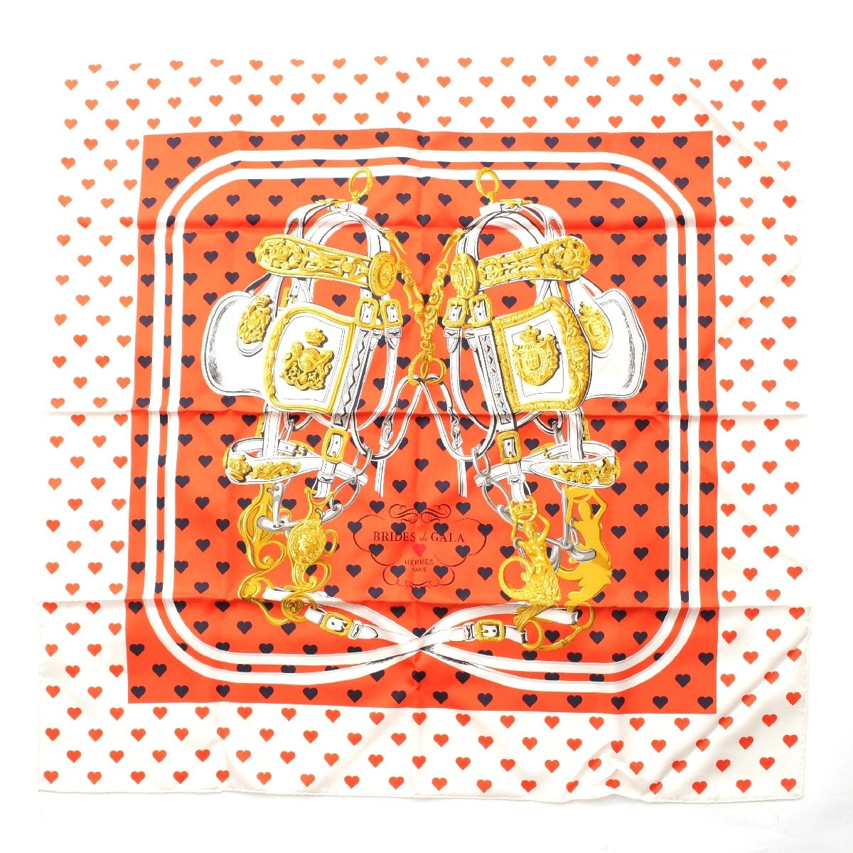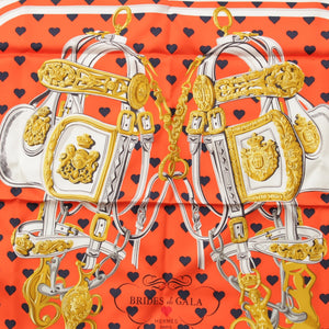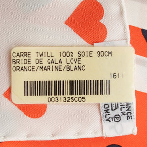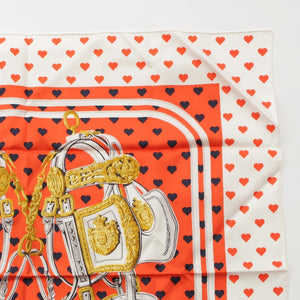 HERMES Limited Edition Carre 90 silk BRIDES de GALA LOVE Ceremonial Bridle Heart Dot scarf Orange white