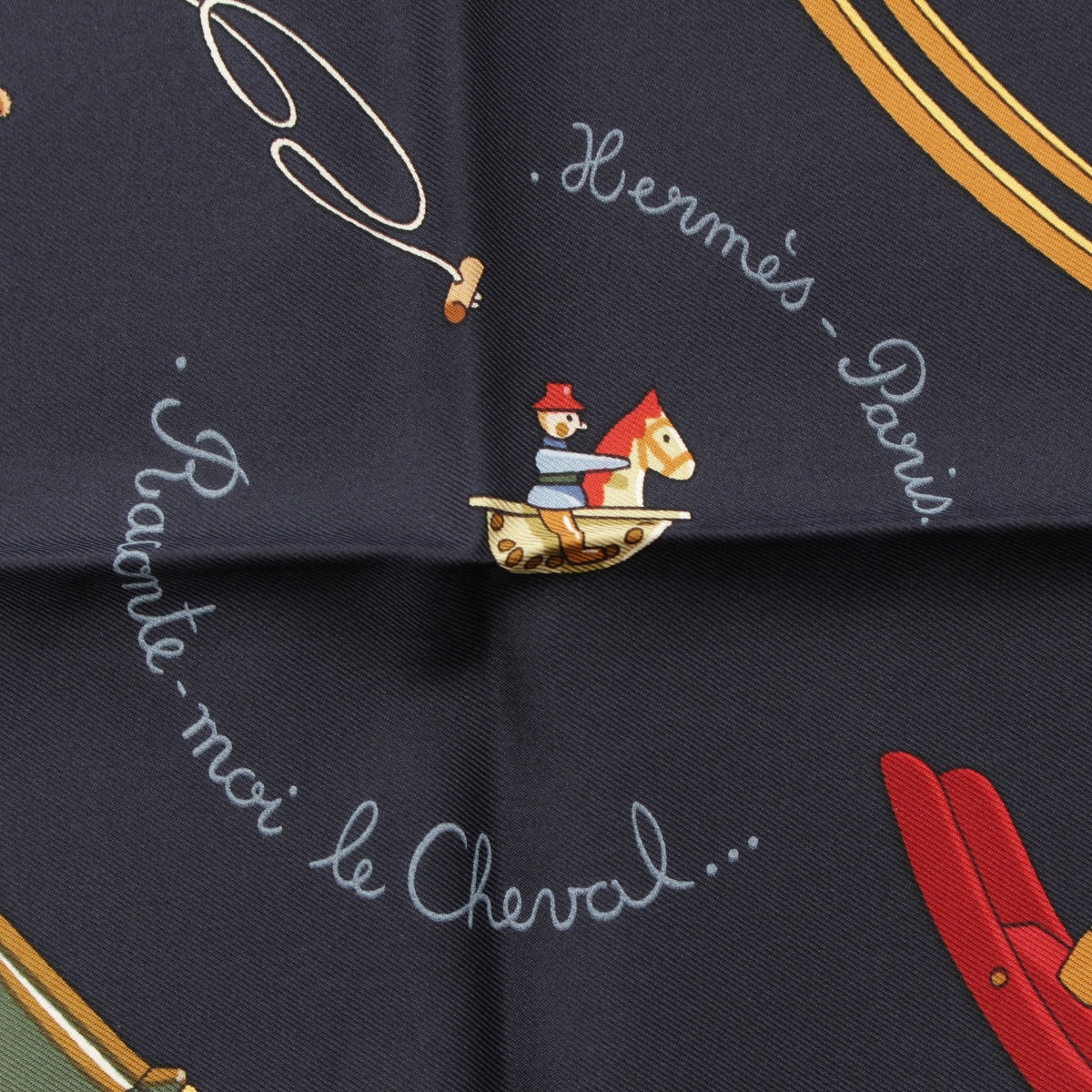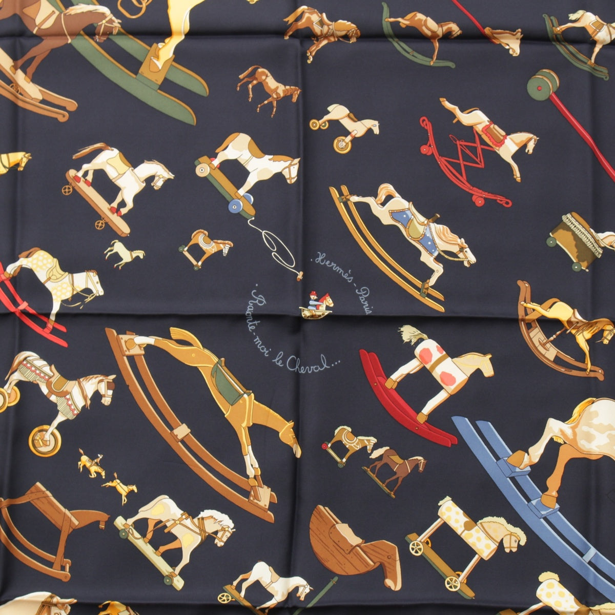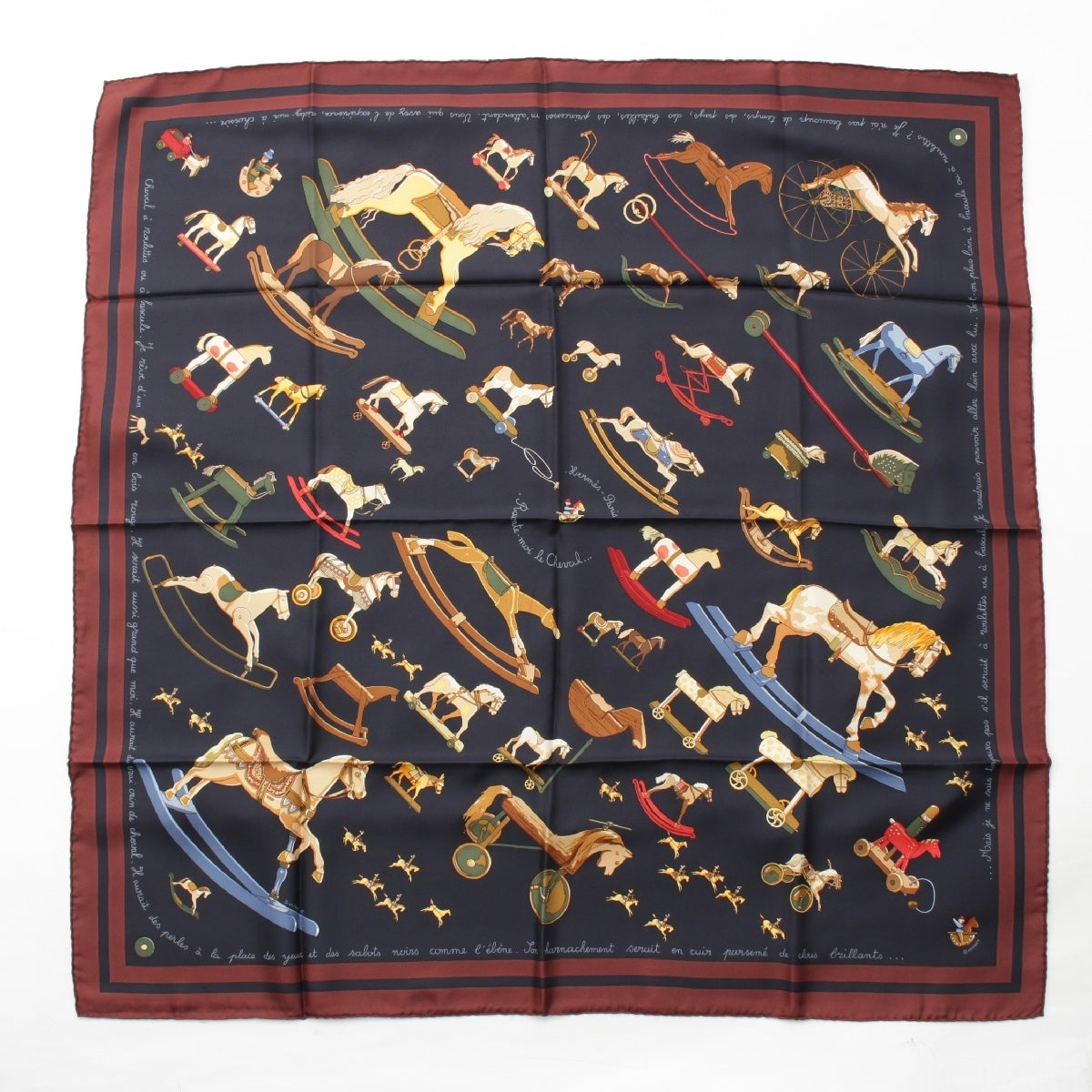 HERMES silk Carre 90 Raconte moi Le Cheval Talking about horses scarf Black x brown