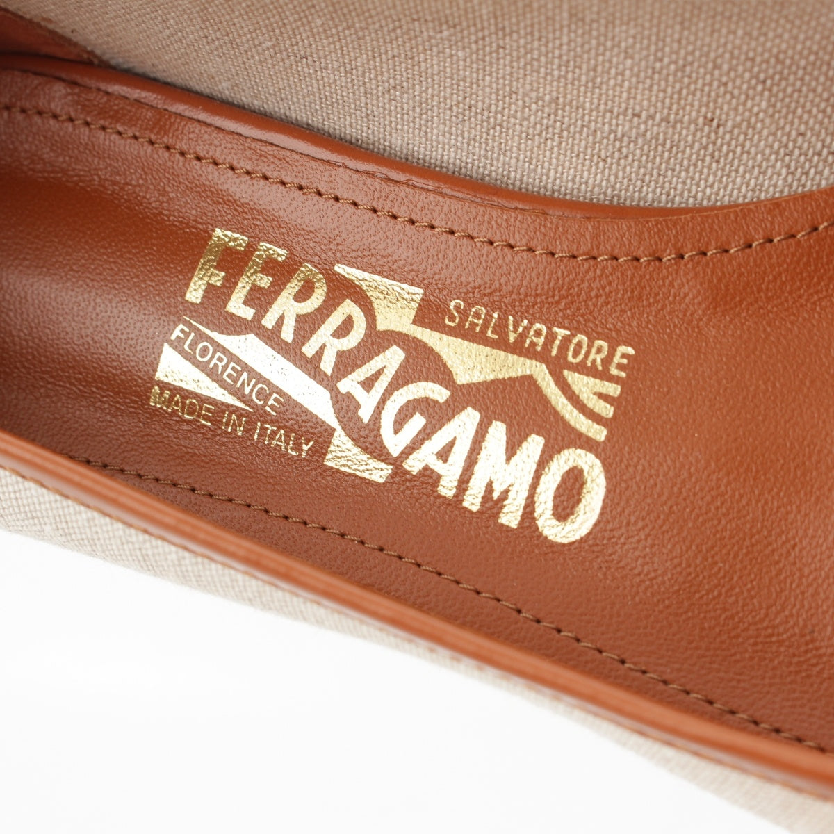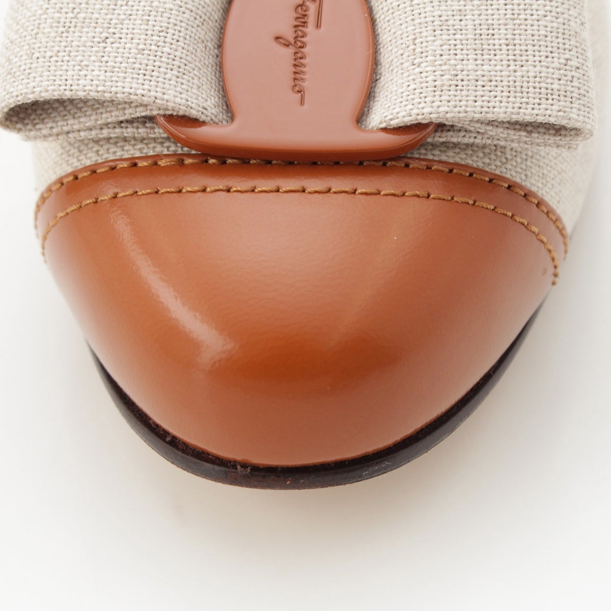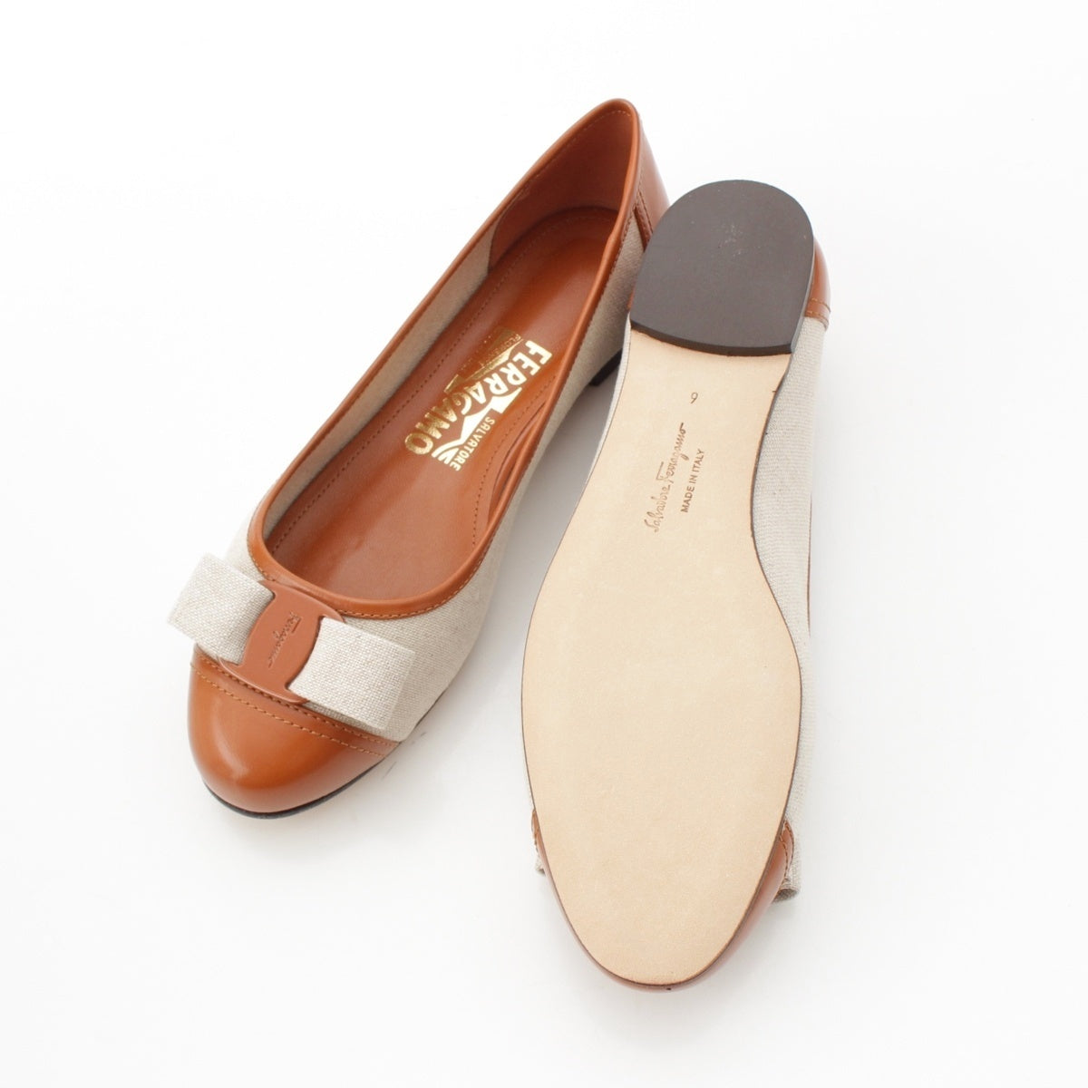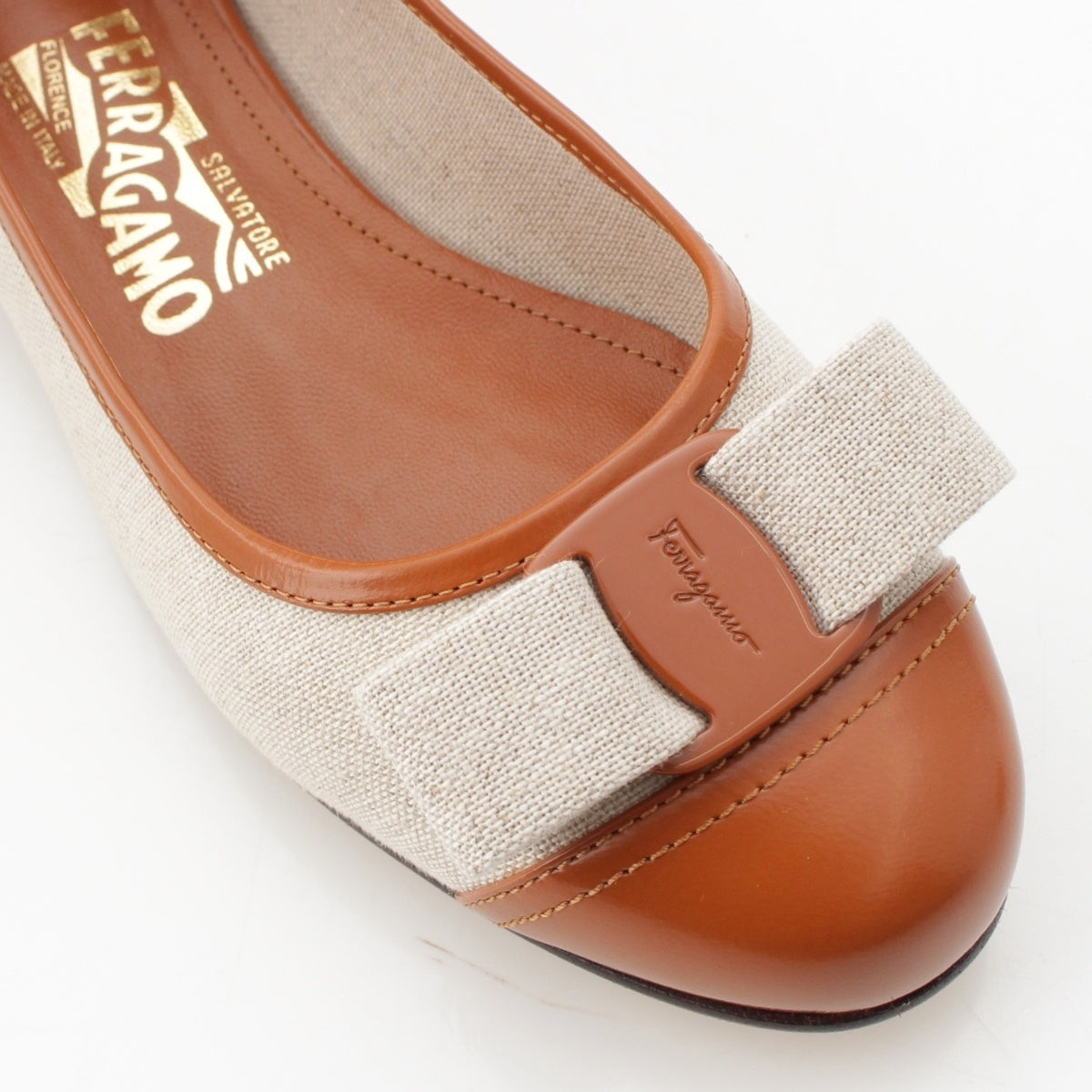 Salvatore Ferragamo VARINA SUN FLATS Lamb leather, cotton and linen Vara Metal Flats pumps Ballet shoes Brown off-white 6D