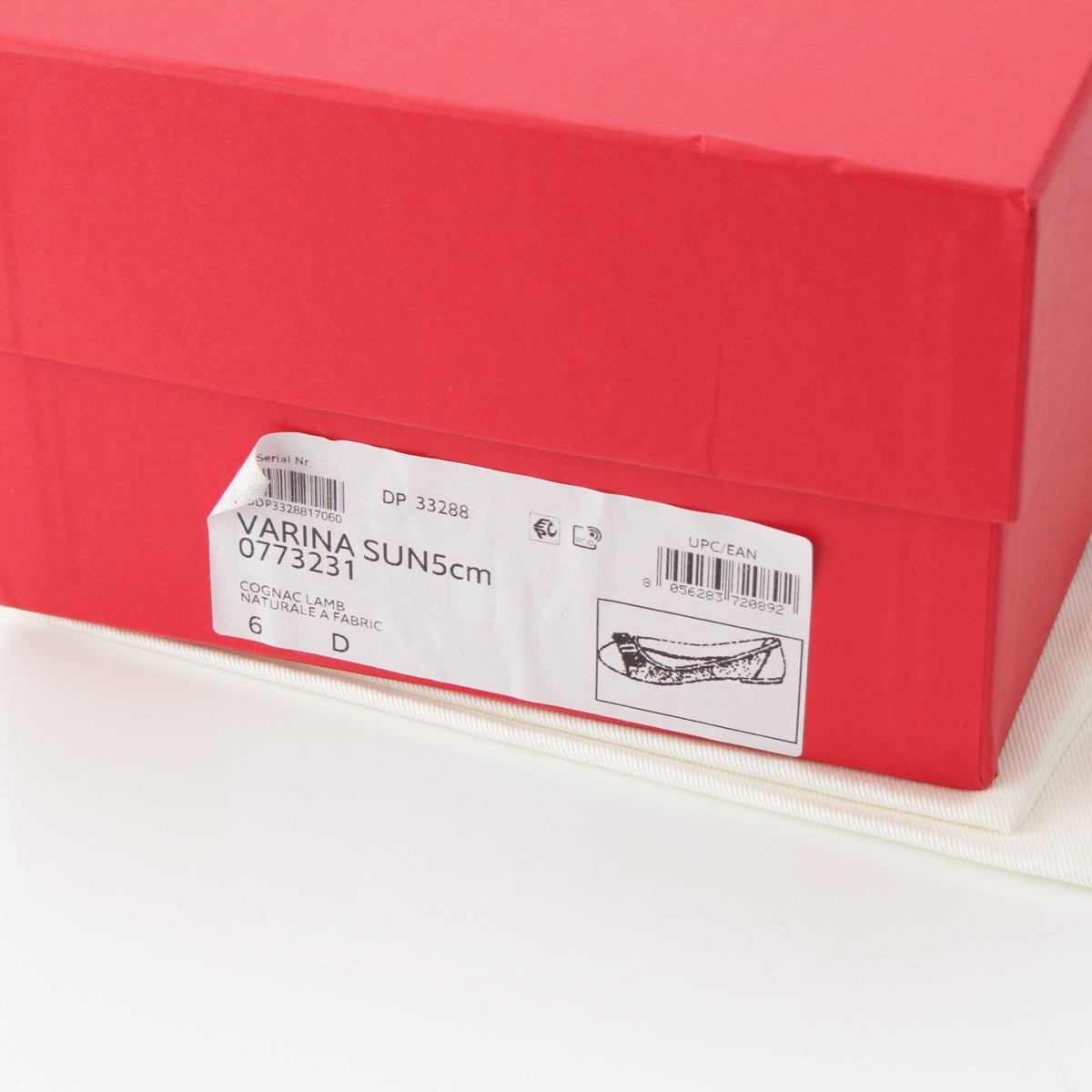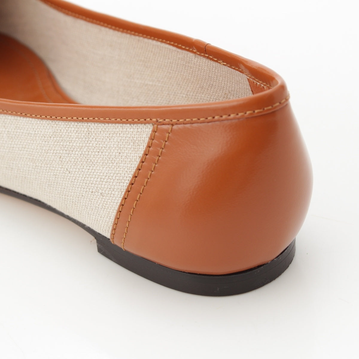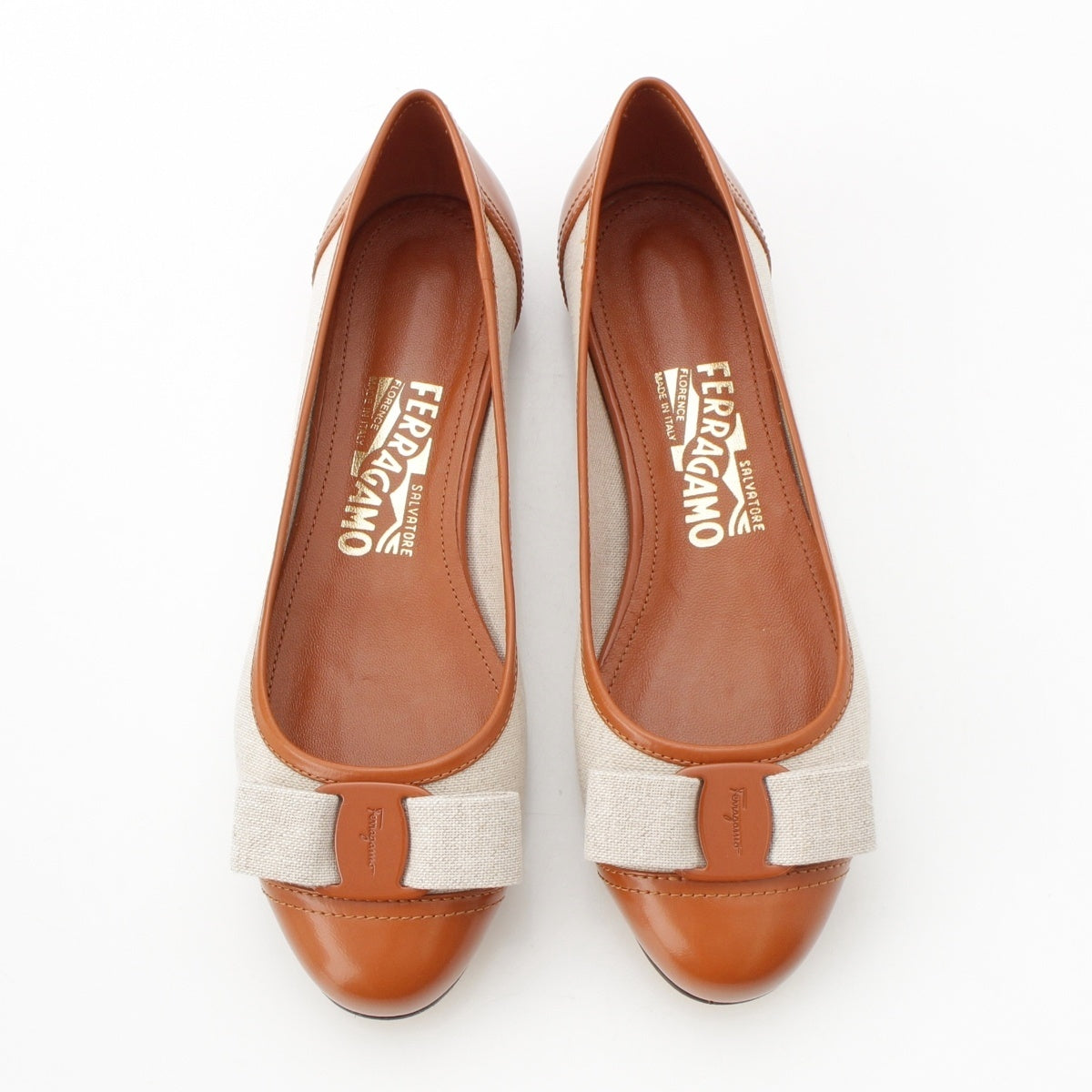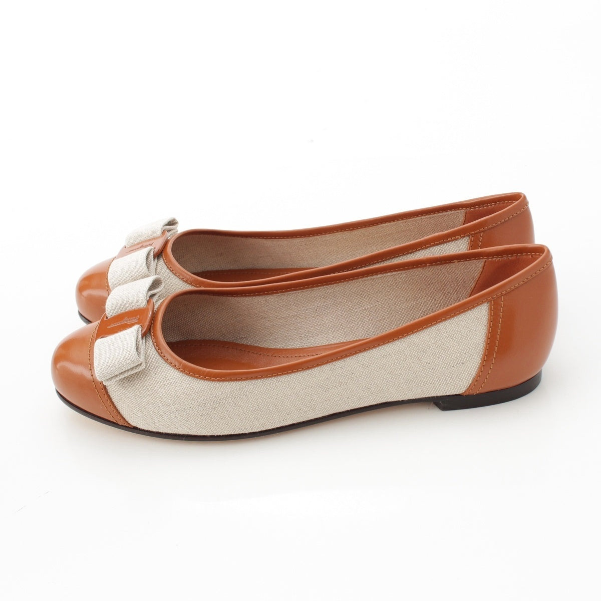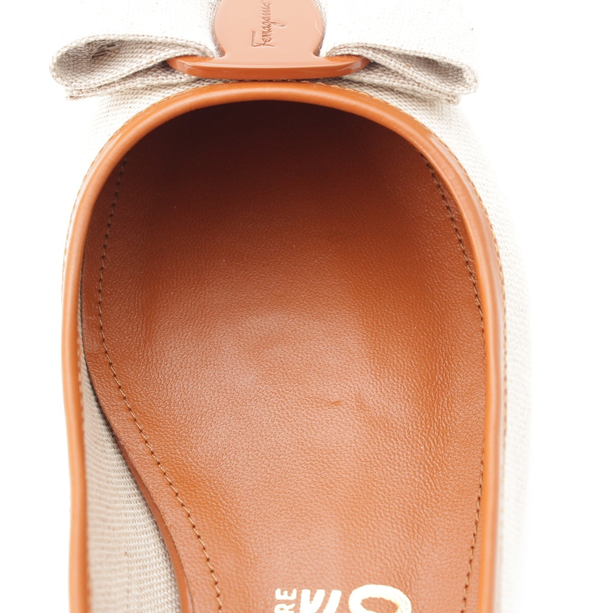 Salvatore Ferragamo VARINA SUN FLATS Lamb leather, cotton and linen Vara Metal Flats pumps Ballet shoes Brown off-white 6D