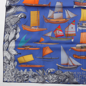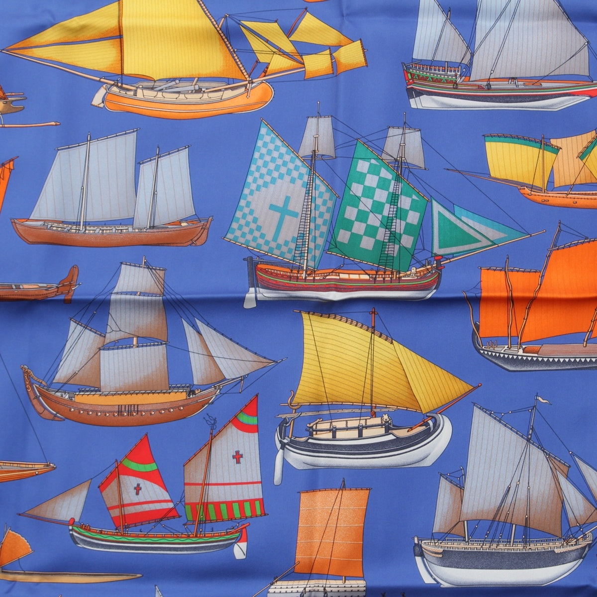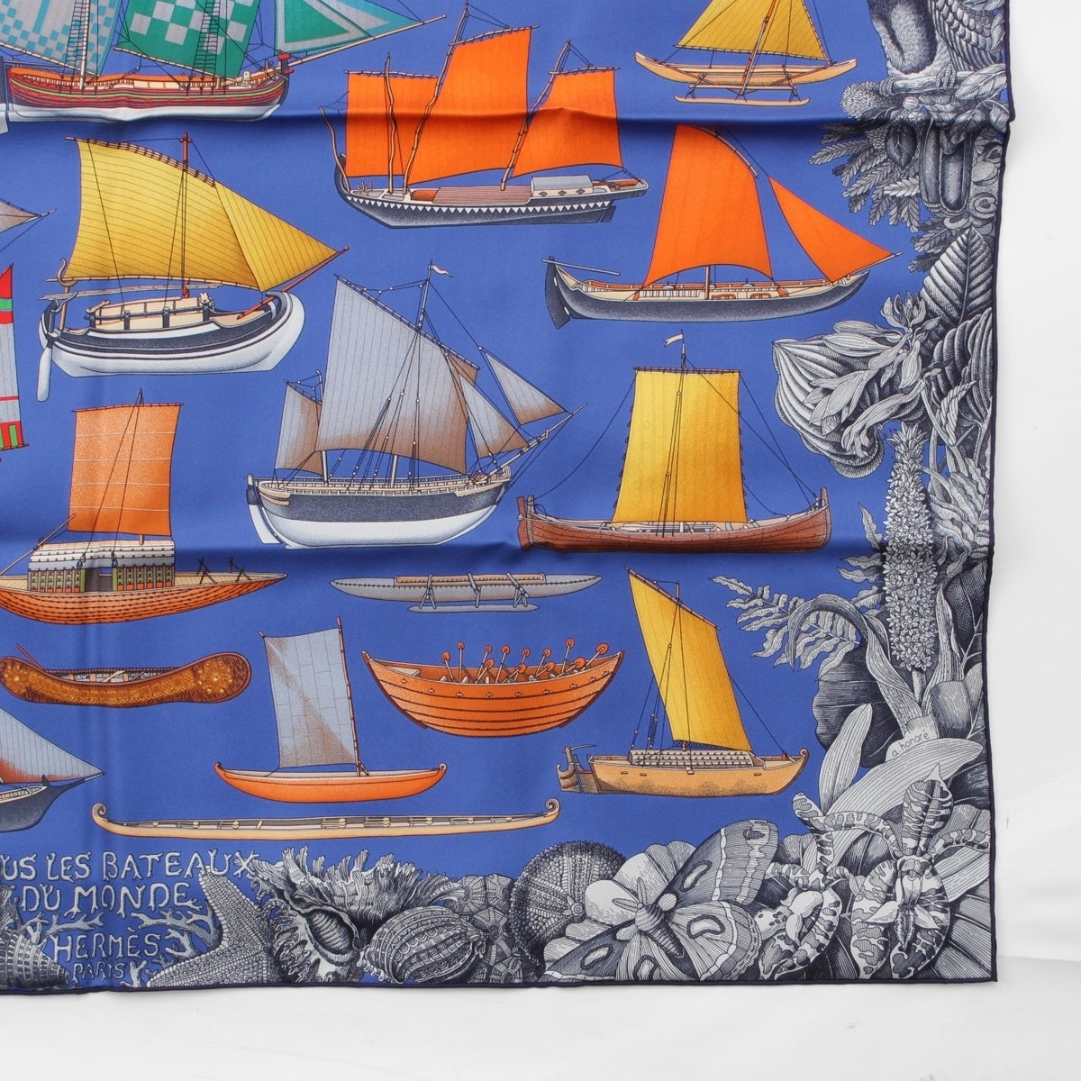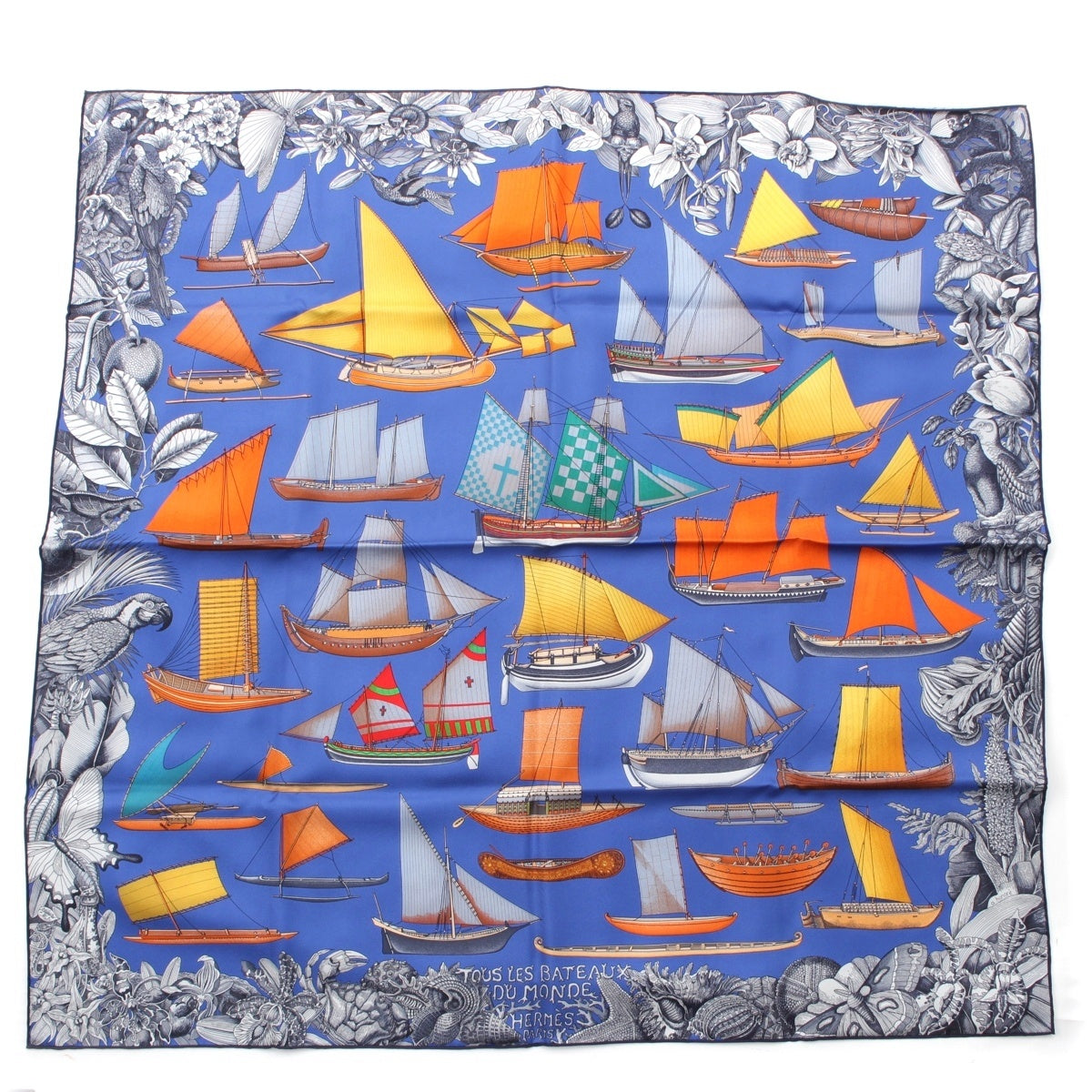 HERMES silk Carre 90 Tous Les Bateaux du Monde Sailing Ships of the World scarf blue