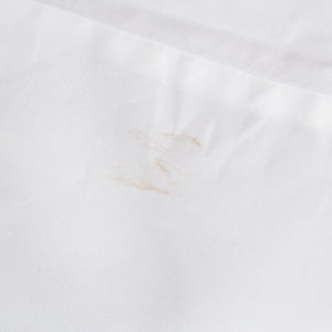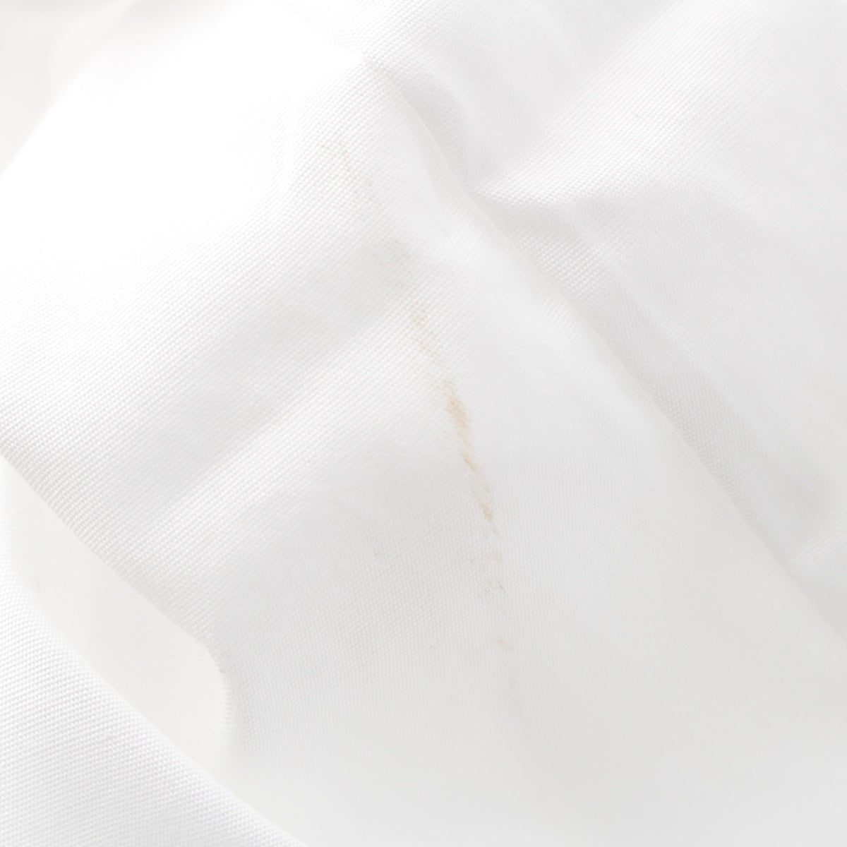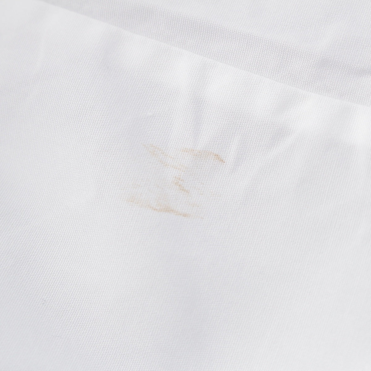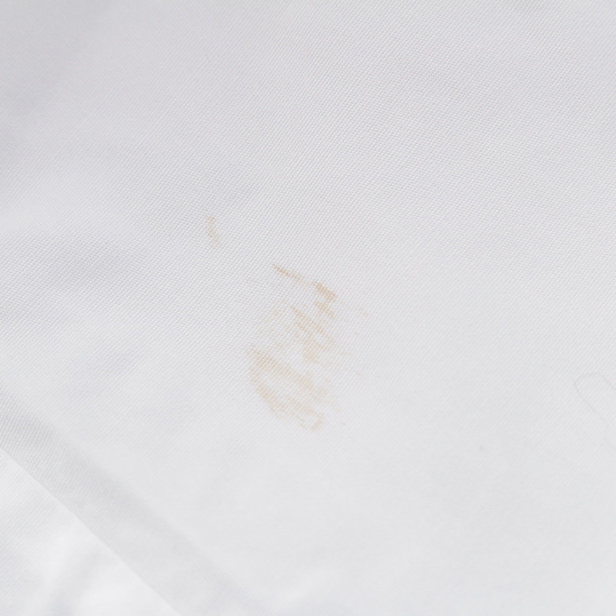 Front: Stained (bottom) and with buttons. Back: Stained (bottom). Right cuff: Stained. Collar: Stained. Inner: Stained and stained (sides).、