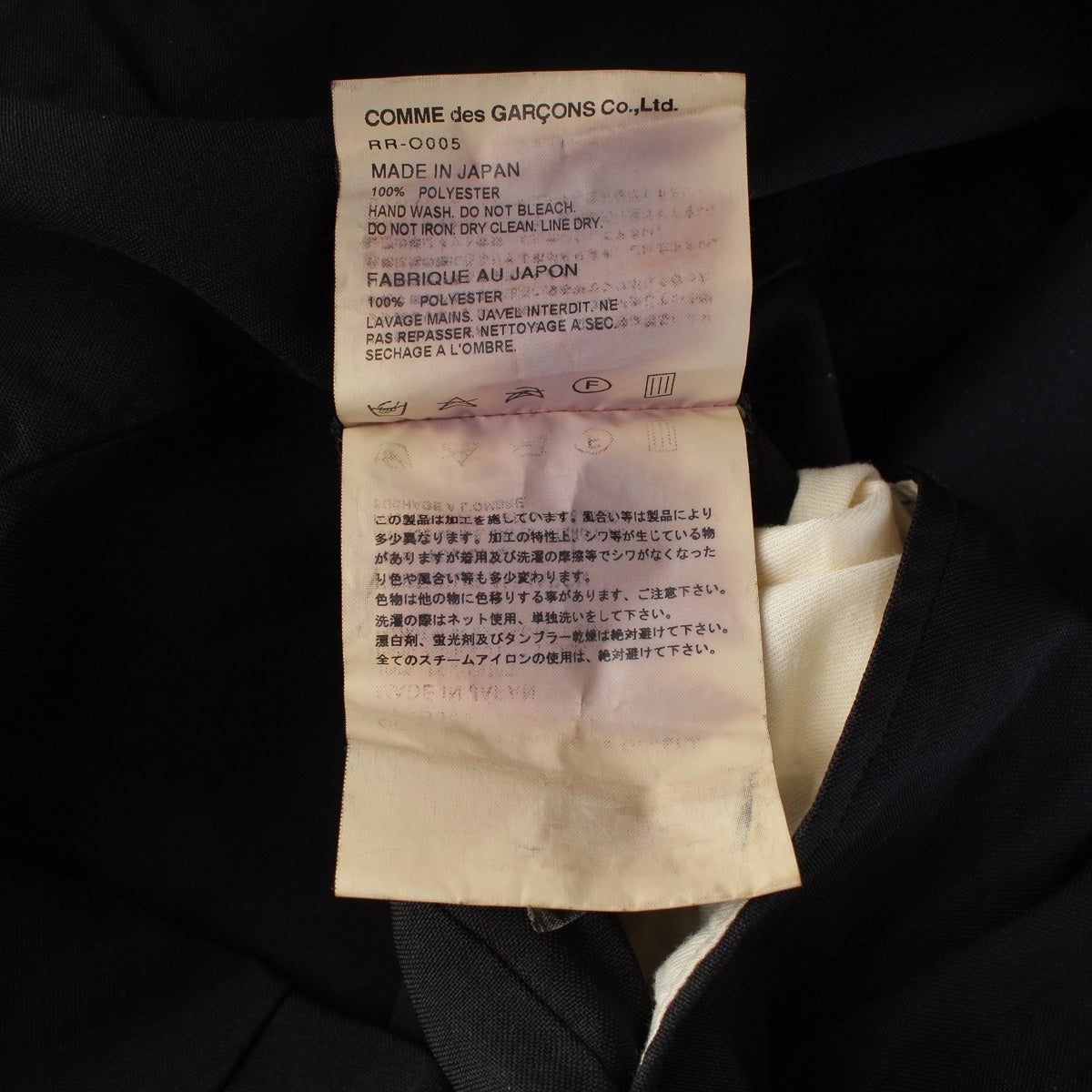 Front: Stains present Back: Stains present Collar: Wrinkled Sides: Frayed Inner: Stains present、