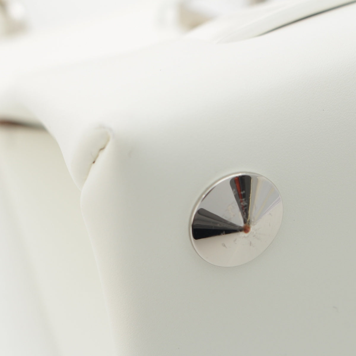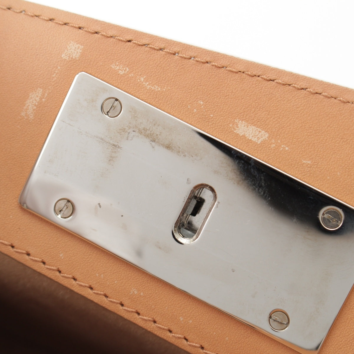 Handle underside: Stained; Bottom rivets: Scratches and discoloration present; Bottom corners: Rubbed and stained.、